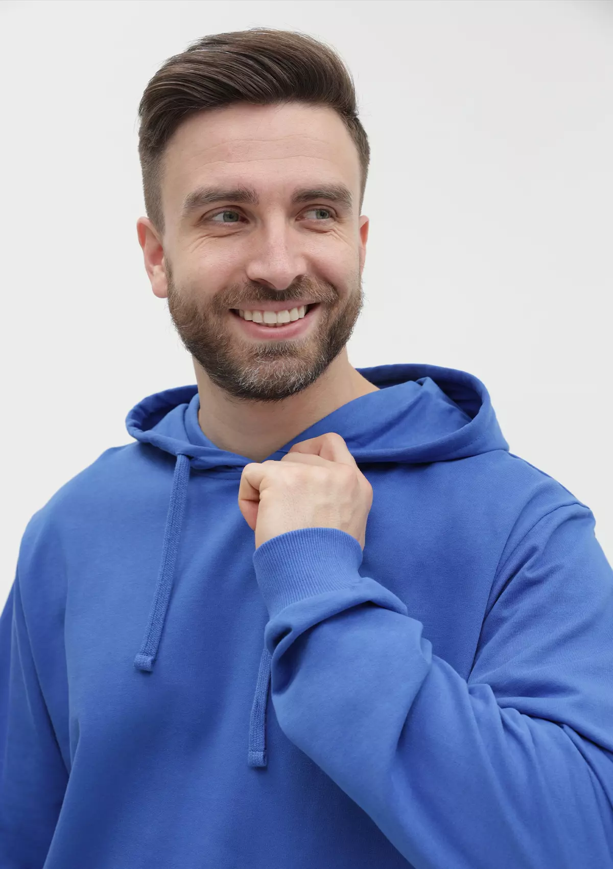 Толстовка прямого силуэта с капюшоном, втачным рукавом и карманом-кенгуру. Капюшон дополнен шнурком для регулирования прилегания, манжет и низ изделия оформлены широкой эластичной резинкой. Возможно два варианта исполнения: контрастные шнурок и бейка/шнурок и бейка в цвет толстовки.