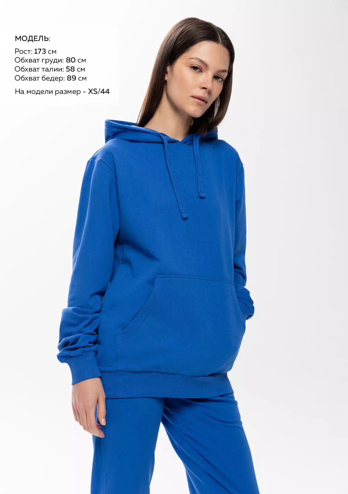 Размер женского худи: XXS/42. Параметры модели: рост 173 см.; обхват груди 80 см.; обхват талии 58 см.; обхват бедер 89 см.