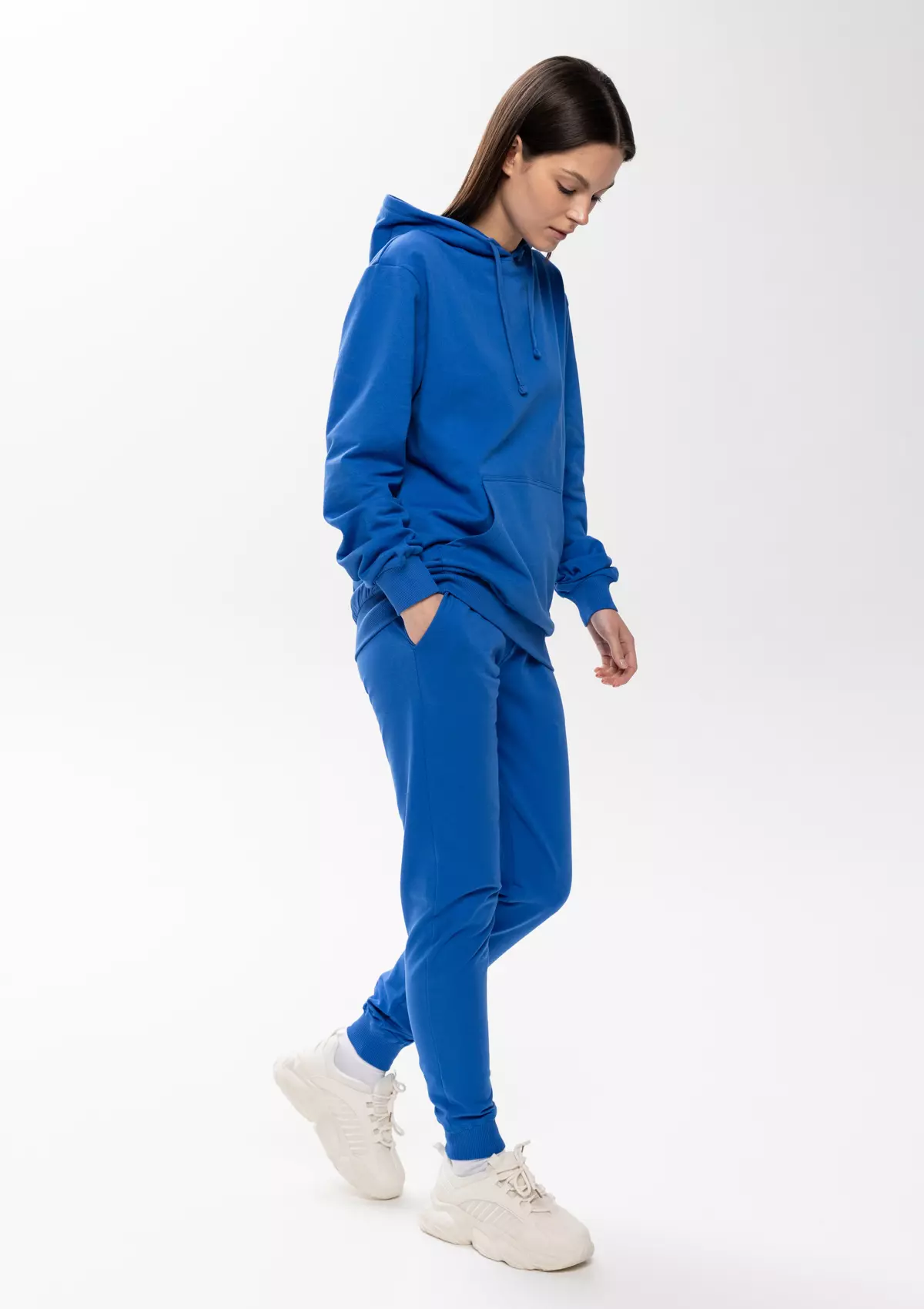 Толстовка прямого силуэта с капюшоном, втачным рукавом и карманом-кенгуру. Капюшон дополнен шнурком для регулирования прилегания, манжет и низ изделия оформлены широкой эластичной резинкой. Возможно два варианта исполнения: контрастные шнурок и бейка/шнурок и бейка в цвет толстовки.