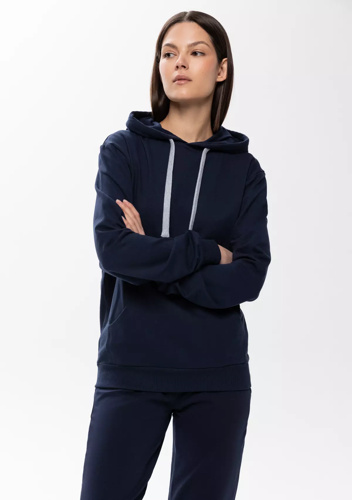 Толстовка прямого силуэта с капюшоном, втачным рукавом и карманом-кенгуру. Капюшон дополнен шнурком для регулирования прилегания, манжет и низ изделия оформлены широкой эластичной резинкой. Возможно два варианта исполнения: контрастные шнурок и бейка/шнурок и бейка в цвет толстовки.