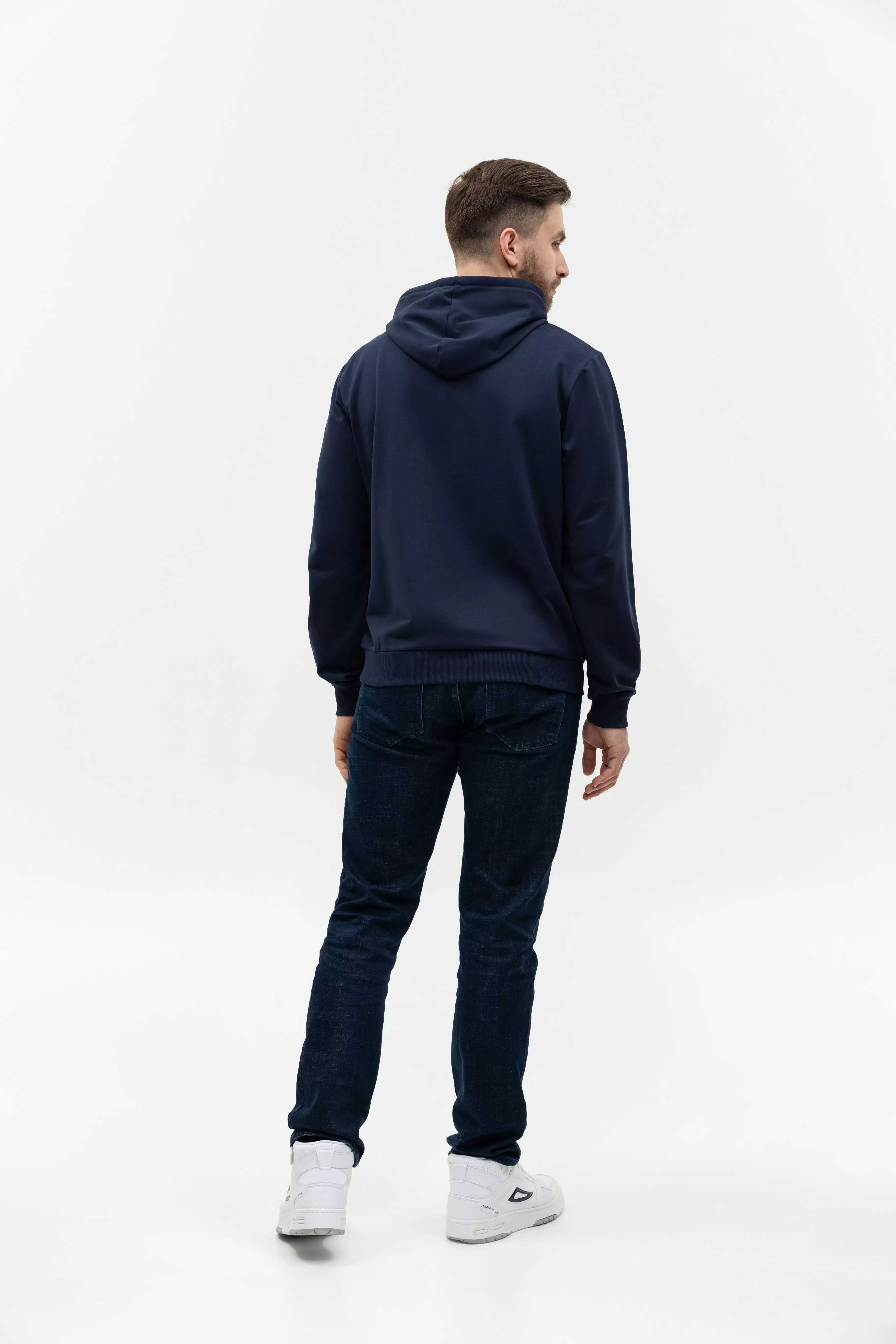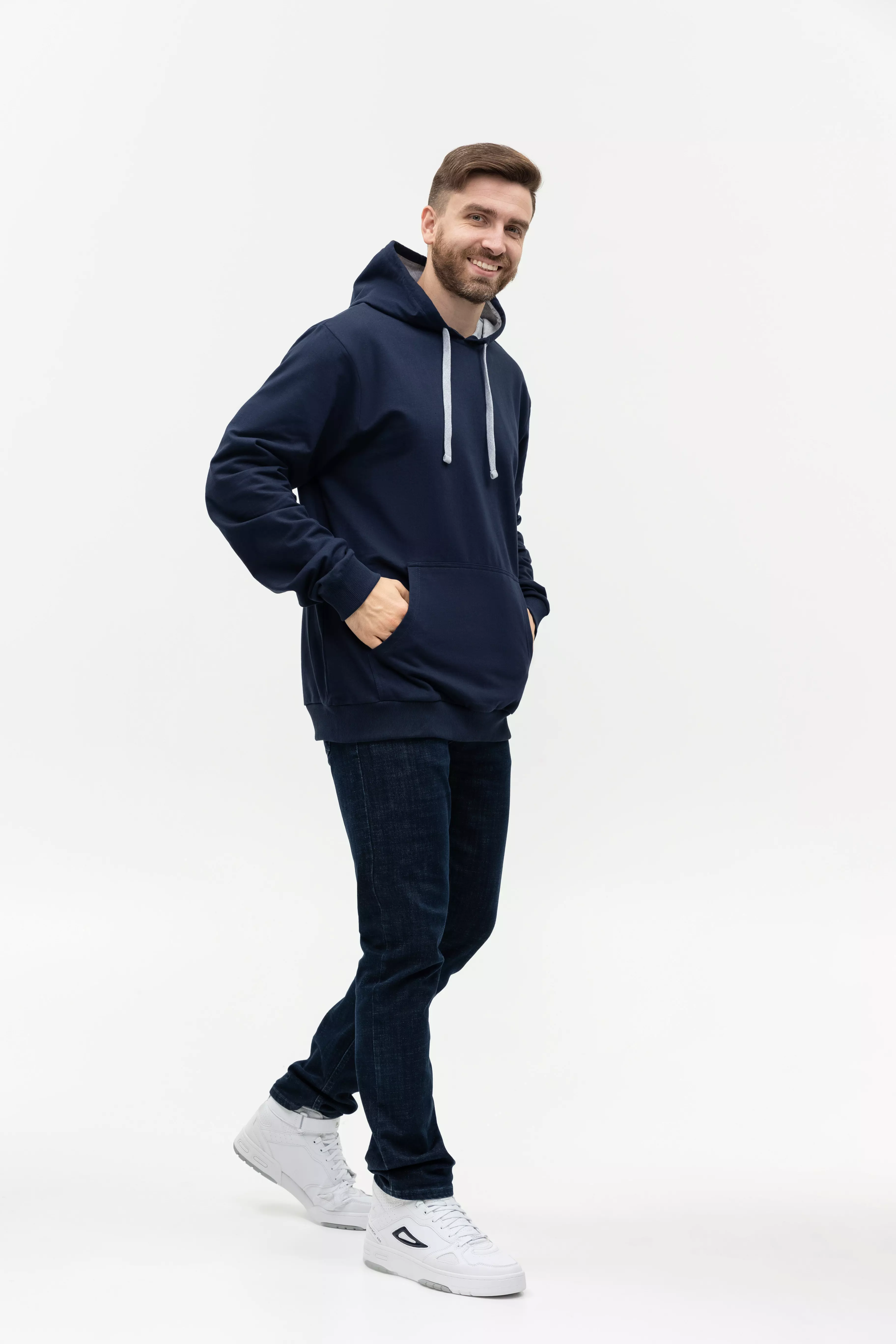 Толстовка прямого силуэта с капюшоном, втачным рукавом и карманом-кенгуру. Капюшон дополнен шнурком для регулирования прилегания, манжет и низ изделия оформлены широкой эластичной резинкой. Возможно два варианта исполнения: контрастные шнурок и бейка/шнурок и бейка в цвет толстовки.