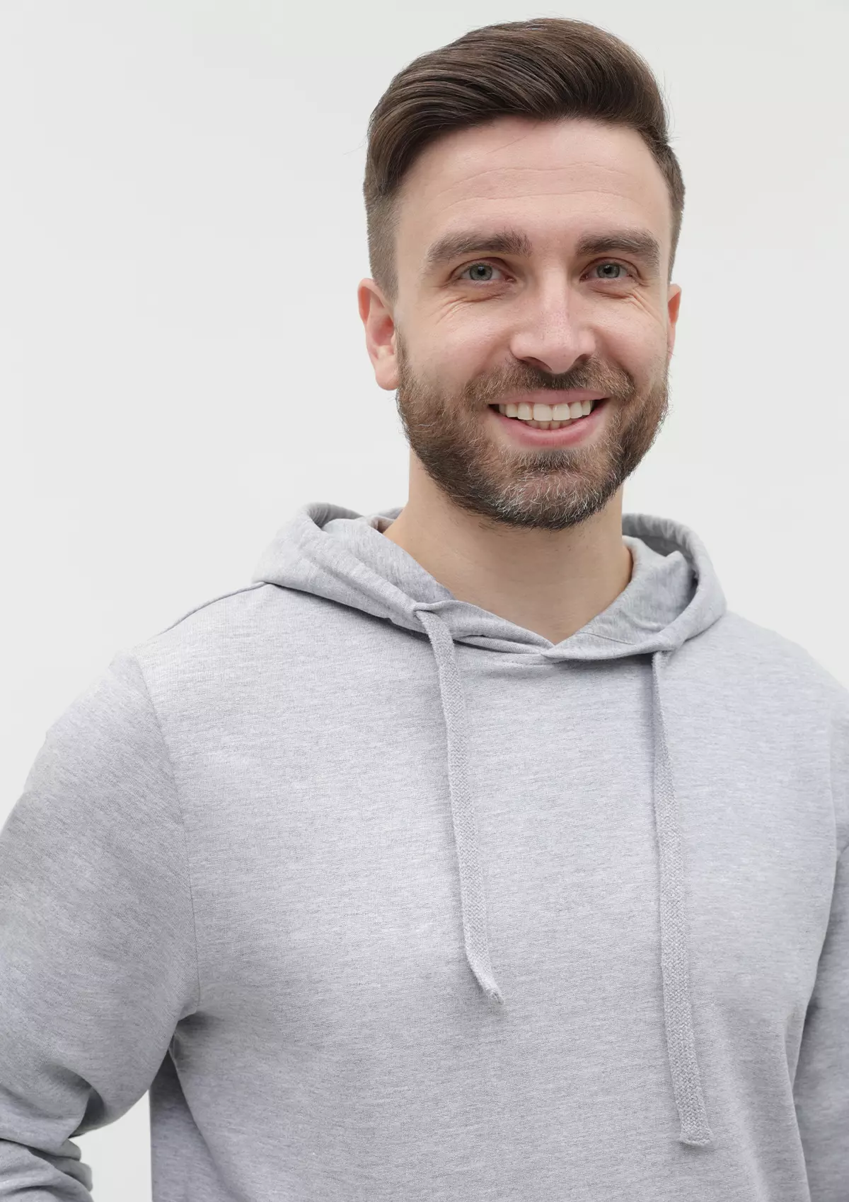 Толстовка прямого силуэта с капюшоном, втачным рукавом и карманом-кенгуру. Капюшон дополнен шнурком для регулирования прилегания, манжет и низ изделия оформлены широкой эластичной резинкой. Возможно два варианта исполнения: контрастные шнурок и бейка/шнурок и бейка в цвет толстовки.