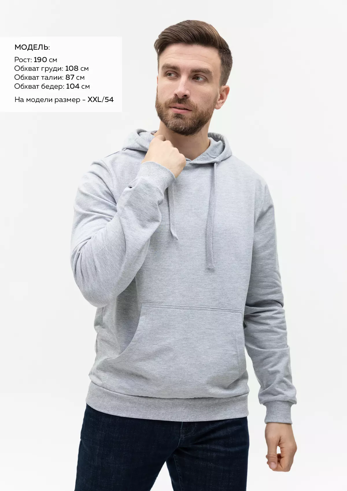 Размер мужского худи: XL/52. Параметры модели: рост 190 см.; обхват груди 108 см.; обхват талии 87 см.; обхват бедер 104 см.