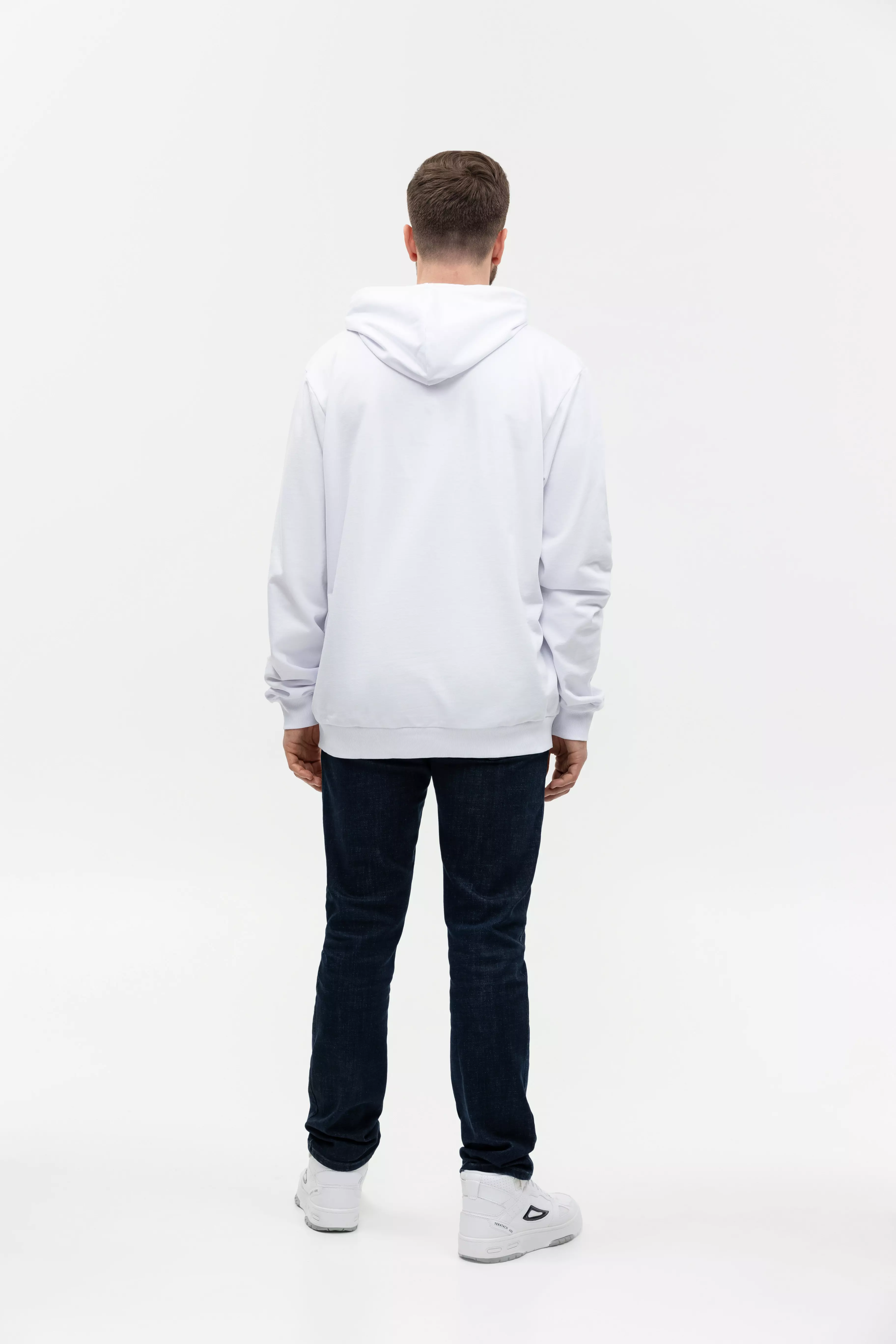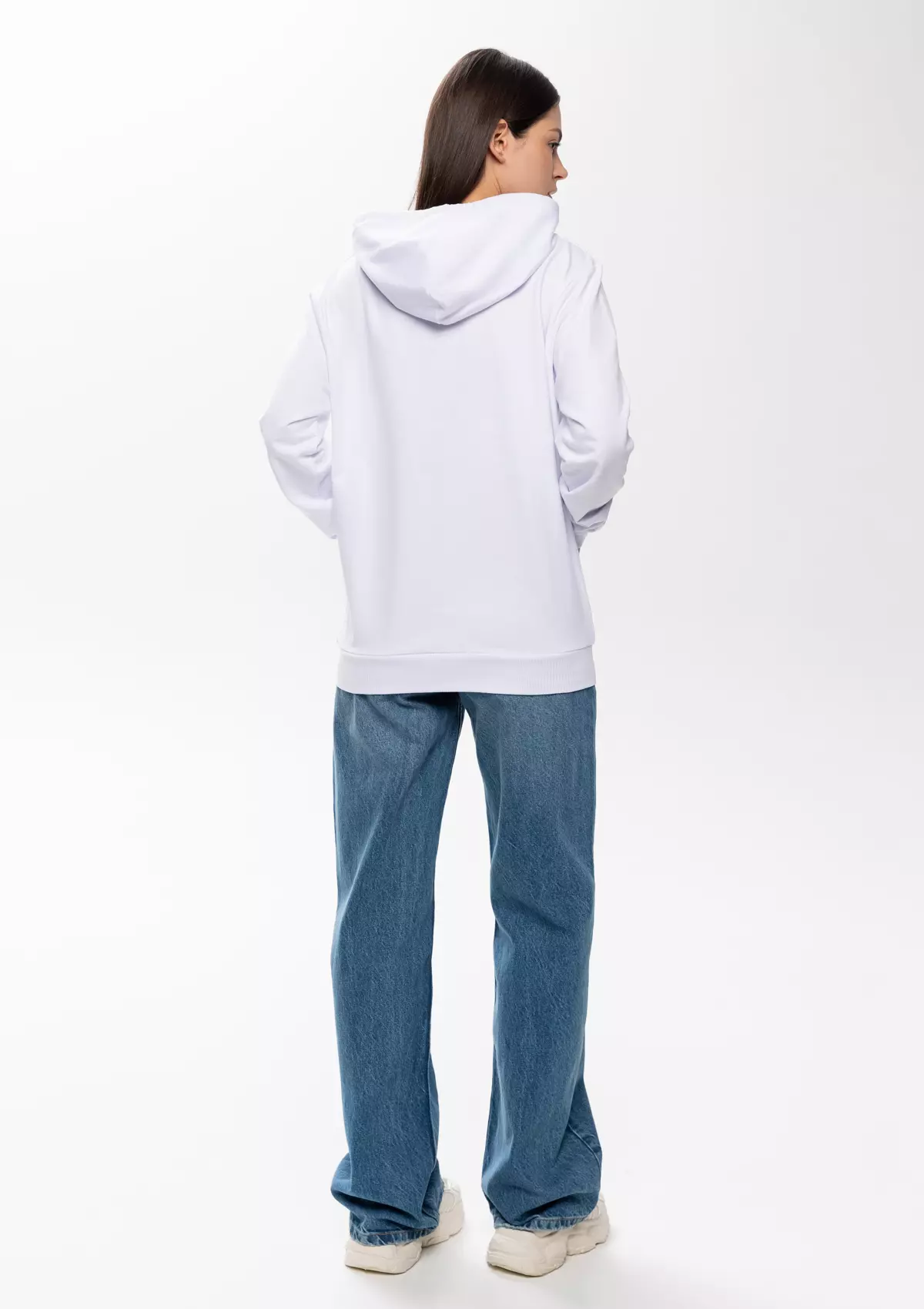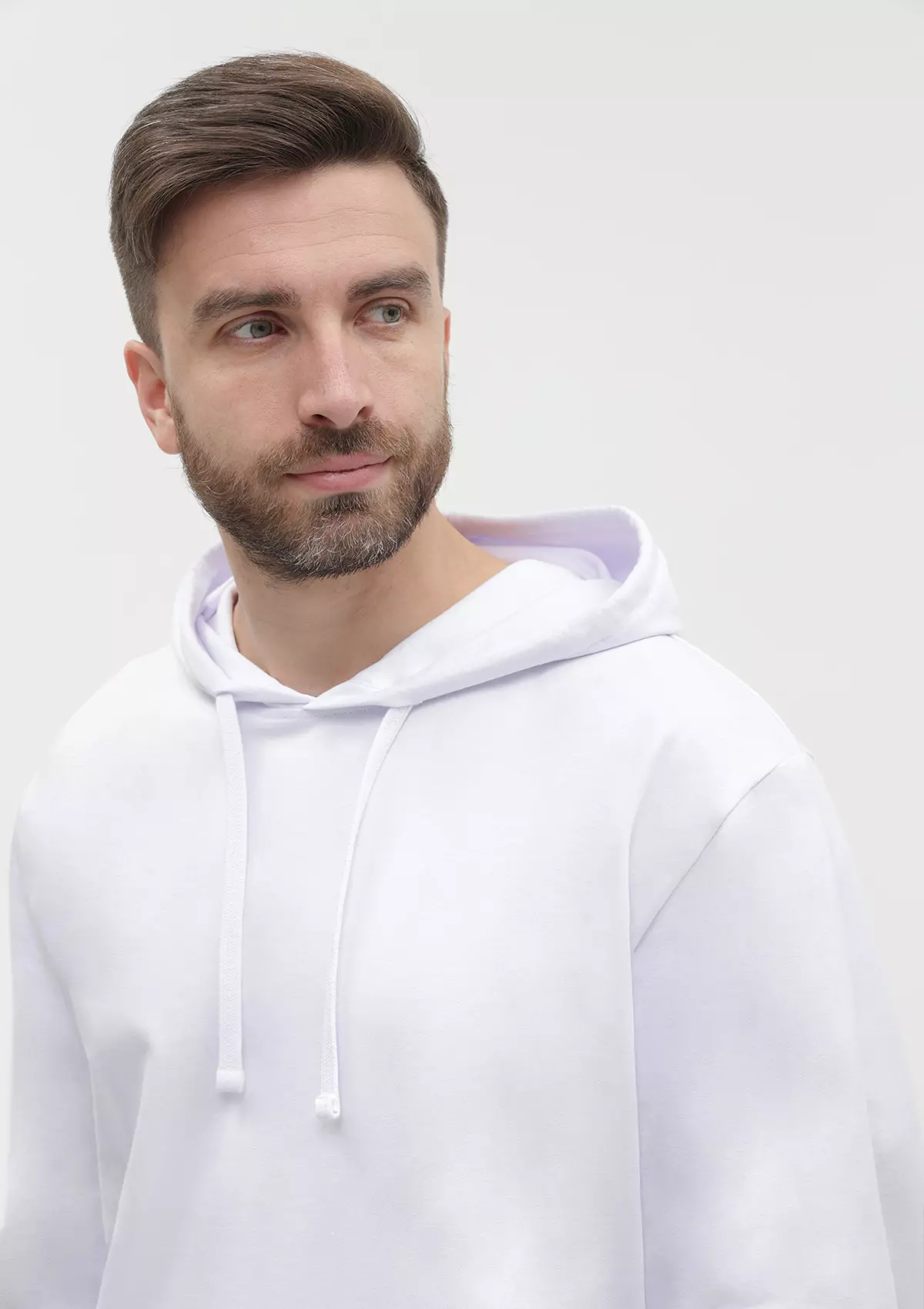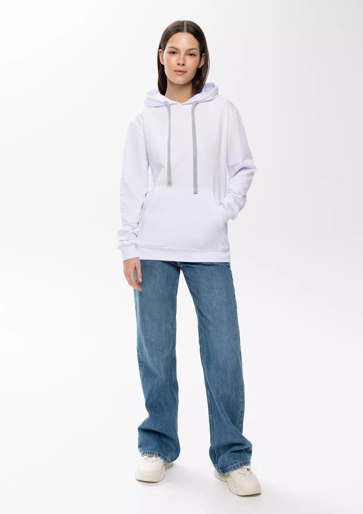 Толстовка прямого силуэта с капюшоном, втачным рукавом и карманом-кенгуру. Капюшон дополнен шнурком для регулирования прилегания, манжет и низ изделия оформлены широкой эластичной резинкой. Возможно два варианта исполнения: контрастные шнурок и бейка/шнурок и бейка в цвет толстовки.