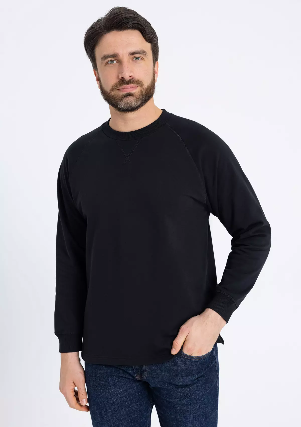 Свободный силуэт, округлый вырез, рукав-реглан и декоративные элементы, отсылающие к классическому крою. Ворот и манжет выполнены широкой эластичной резинкой.