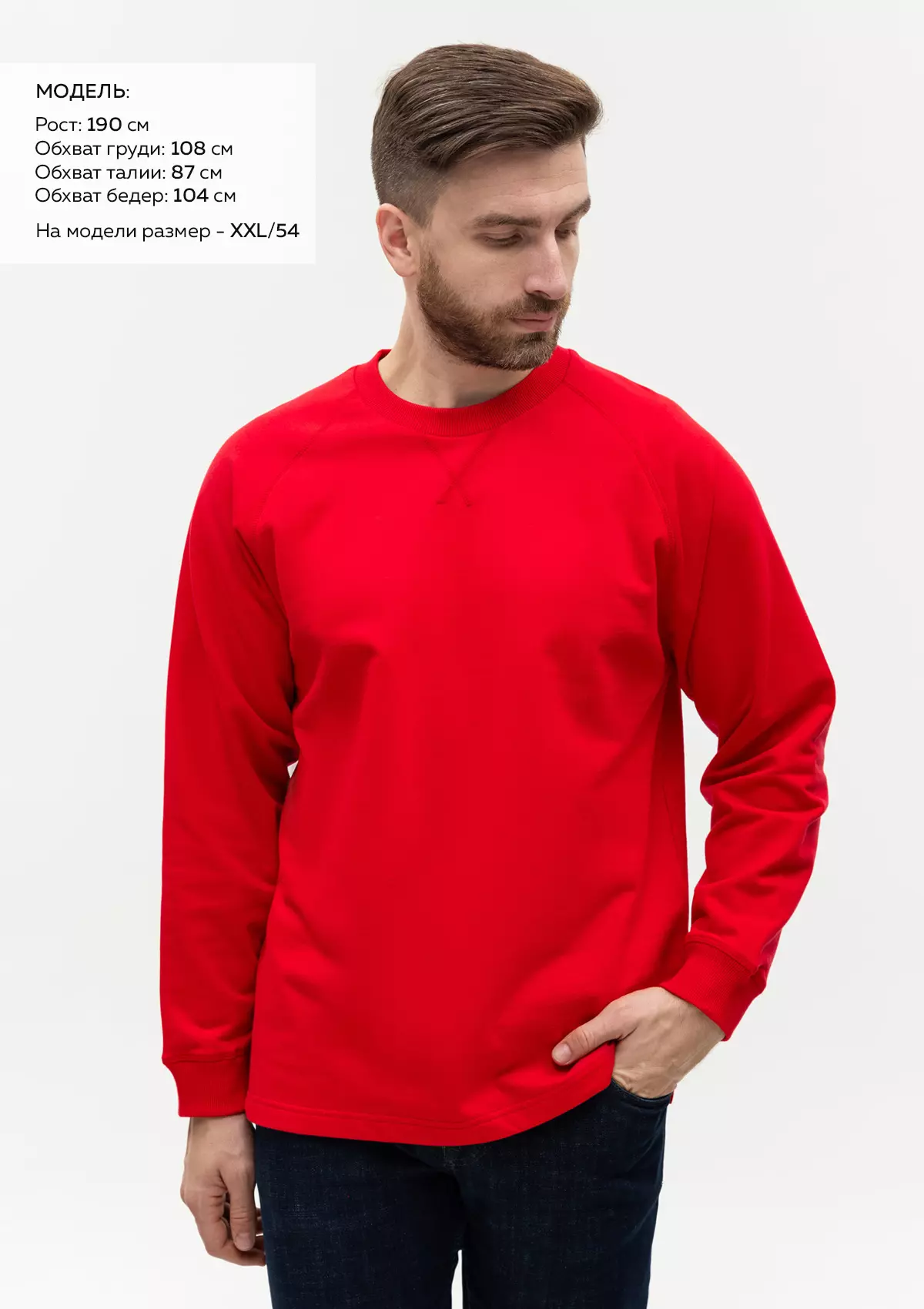 Размер мужского свитшота: XXL/54. Параметры модели: рост 190 см.; обхват груди 108 см.; обхват талии 87 см.; обхват бедер 104 см.