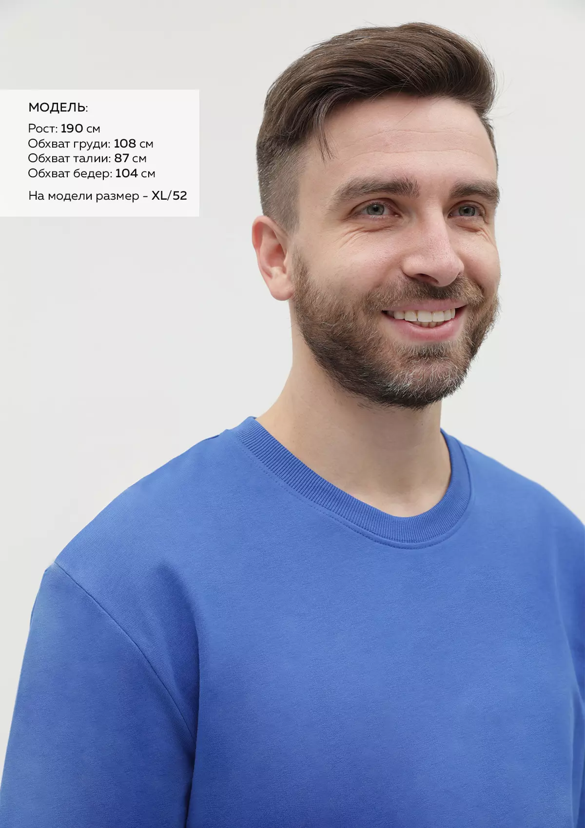 Размер мужского свитшота: XL/52. Параметры модели: рост 190 см.; обхват груди 108 см.; обхват талии 87 см.; обхват бедер 104 см.