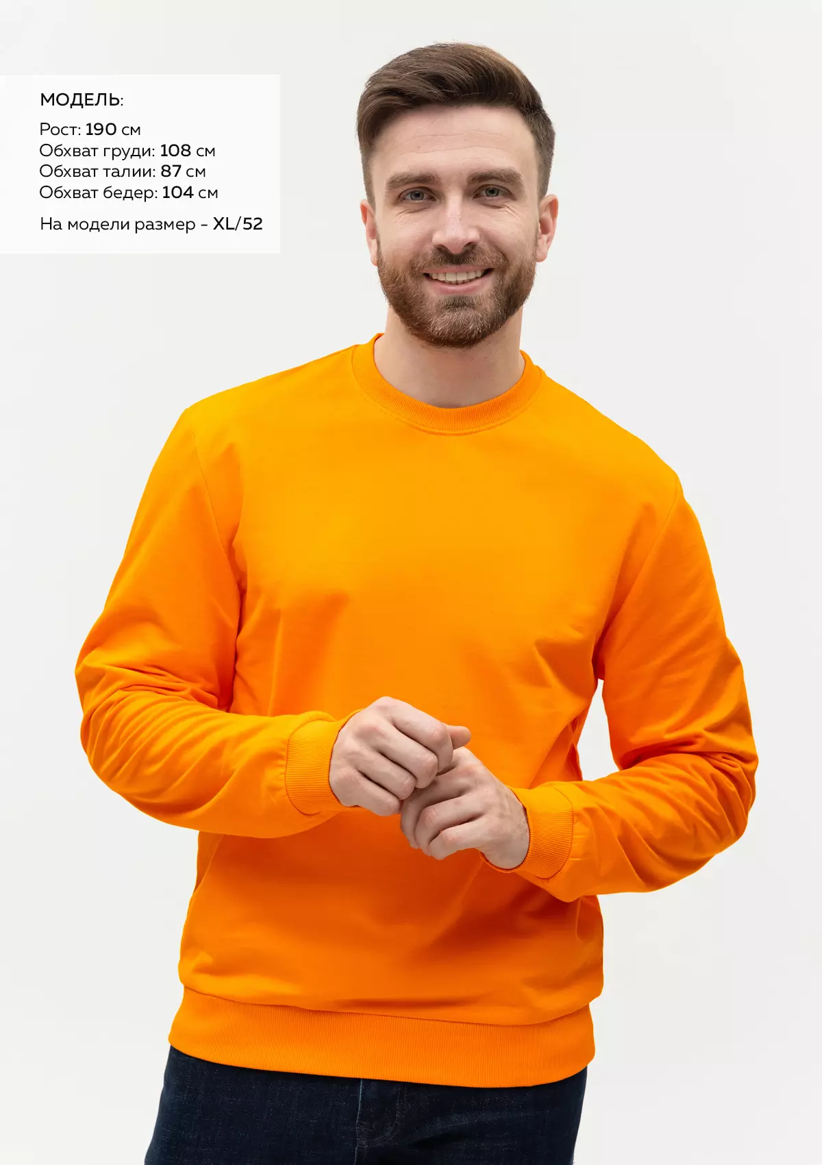 Размер мужского свитшота: XL/52. Параметры модели: рост 190 см.; обхват груди 108 см.; обхват талии 87 см.; обхват бедер 104 см.