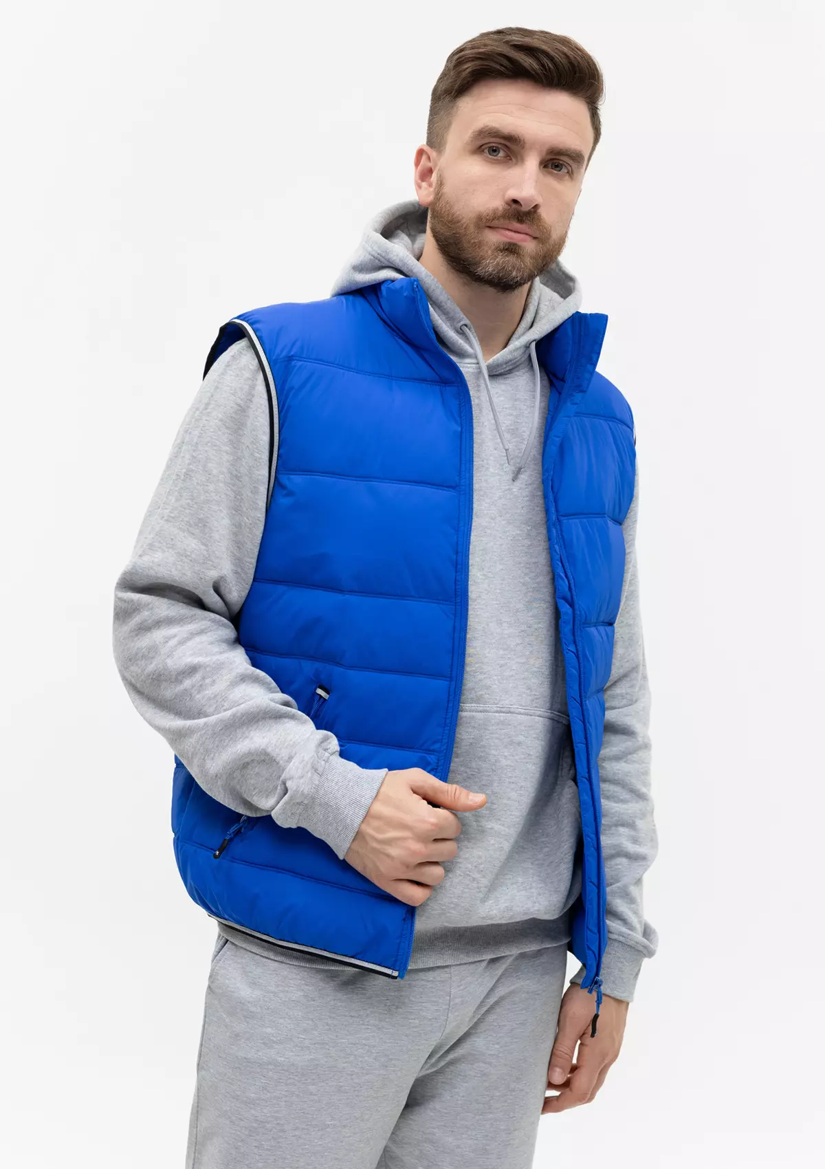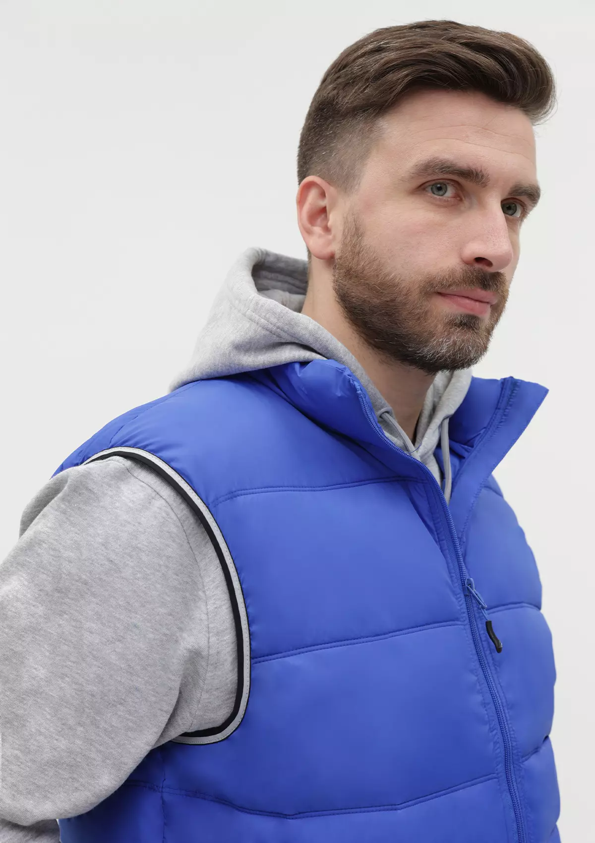 Мужской жилет прямого силуэта с геометричной стежкой, воротником-стойкой, прорезным карманом и застежкой на молнию. Изделие дополнено контрастной резинкой по пройме и линии низа для дополнительной защиты от холода и ветра.