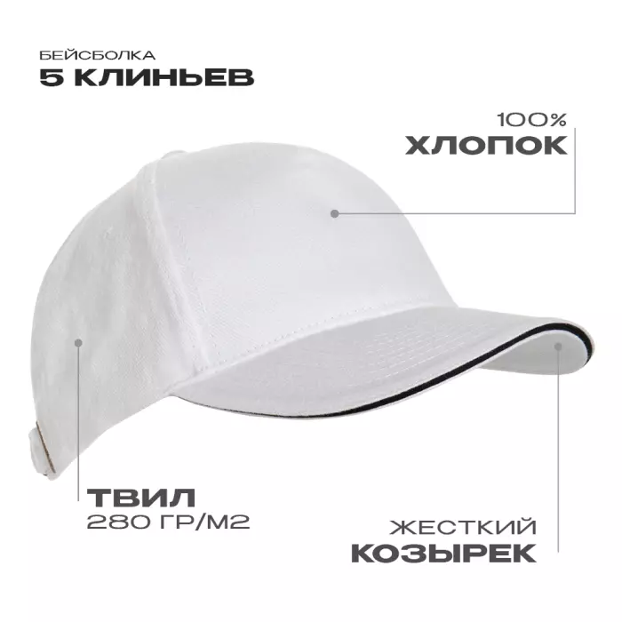 Пятиклиновый пошив без лобового шва, жесткий изогнутый козырек «сэндвич» с контрастным кантом и прочная застежка на металлический замок.