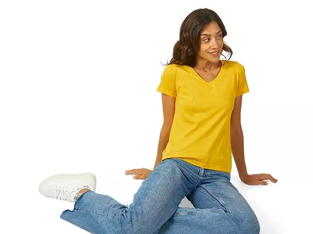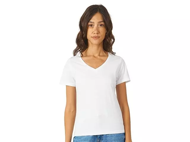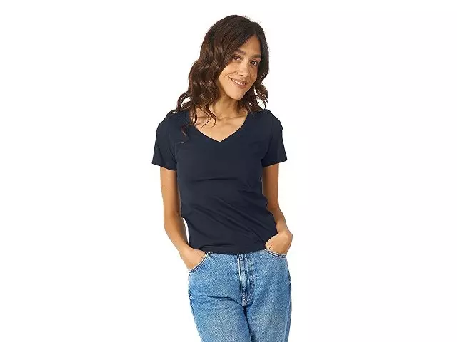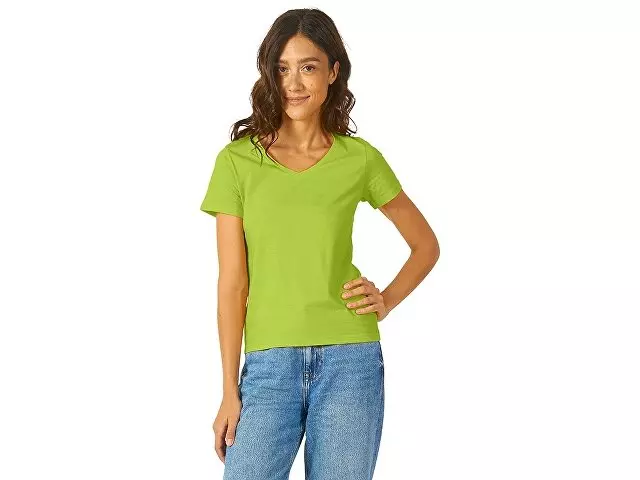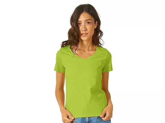Женская футболка из натурального хлопка с элегантным V-образным вырезом. Материал отлично подходит для нанесения рекламной информации. Натуральная ткань не вызывает раздражения кожи.