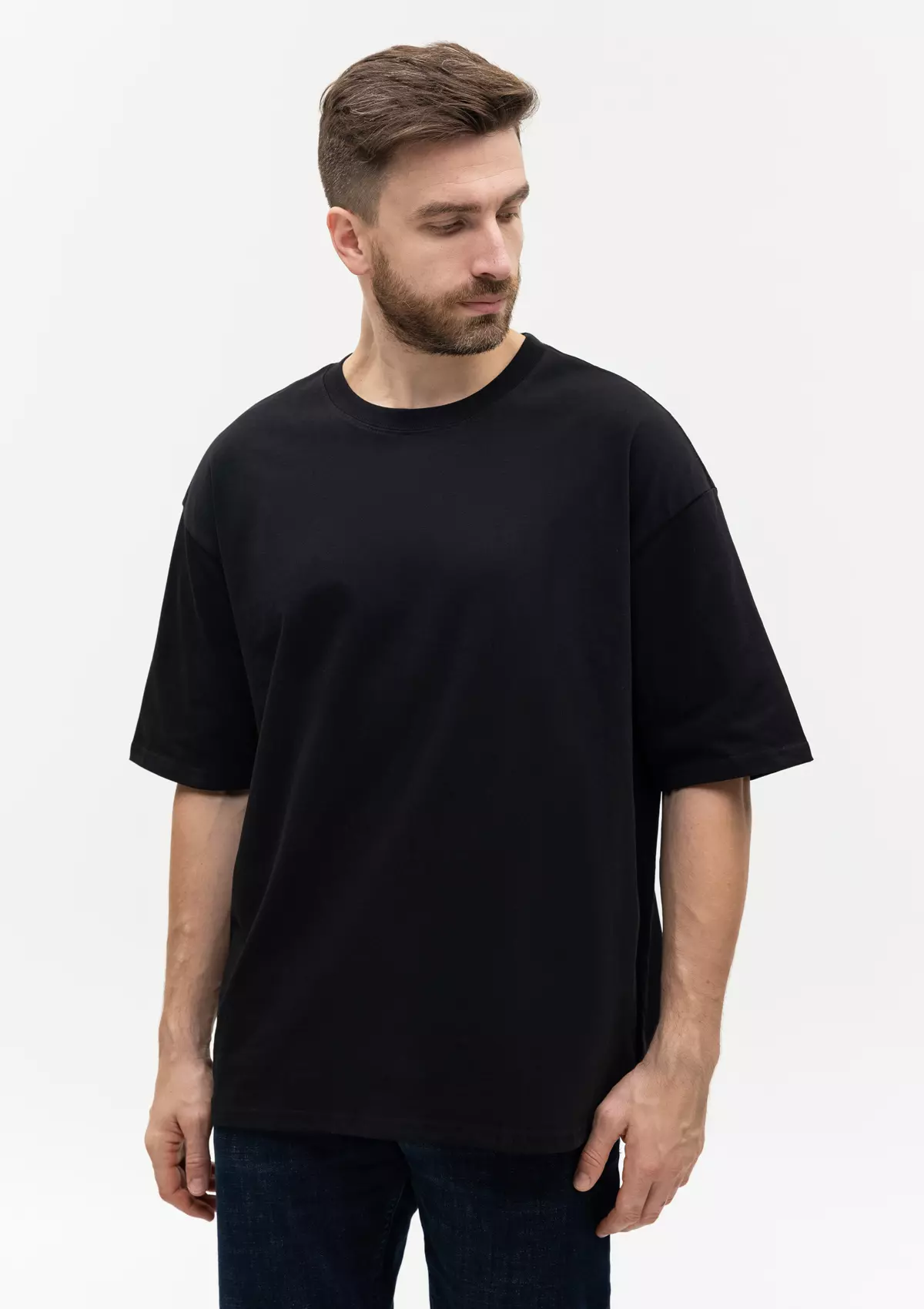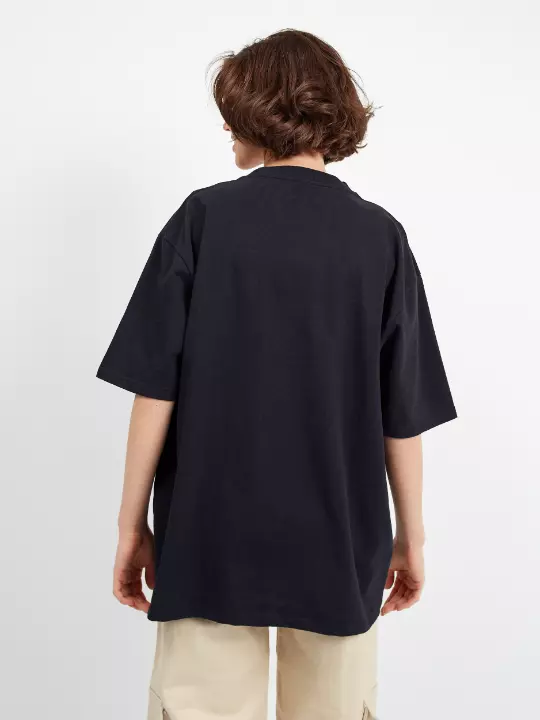 Универсальная футболка силуэта-oversize с округлым воротом и спущенной линией плеча.