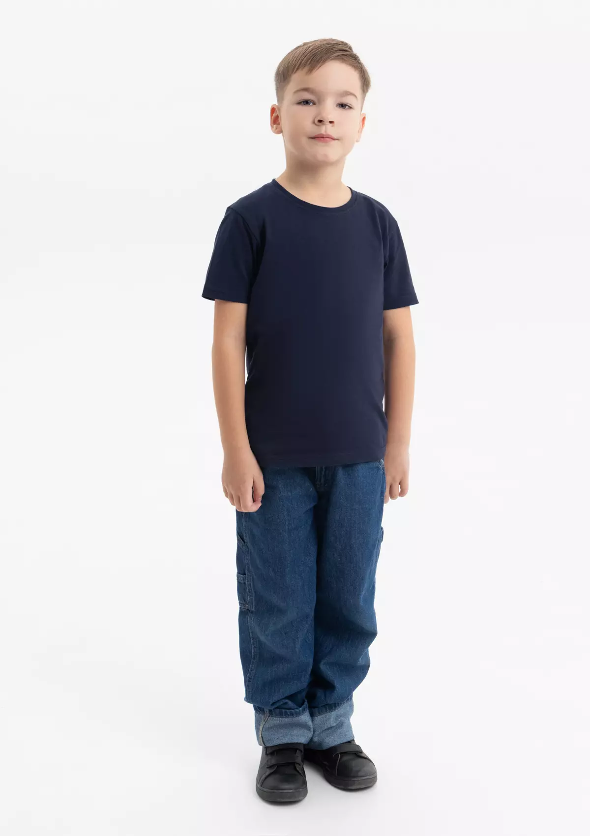 Детская футболка свободного силуэта с округлым воротом и втачным рукавом. Плечевые швы и шов горловины спинки усилены настрочной бейкой из основного полотна.