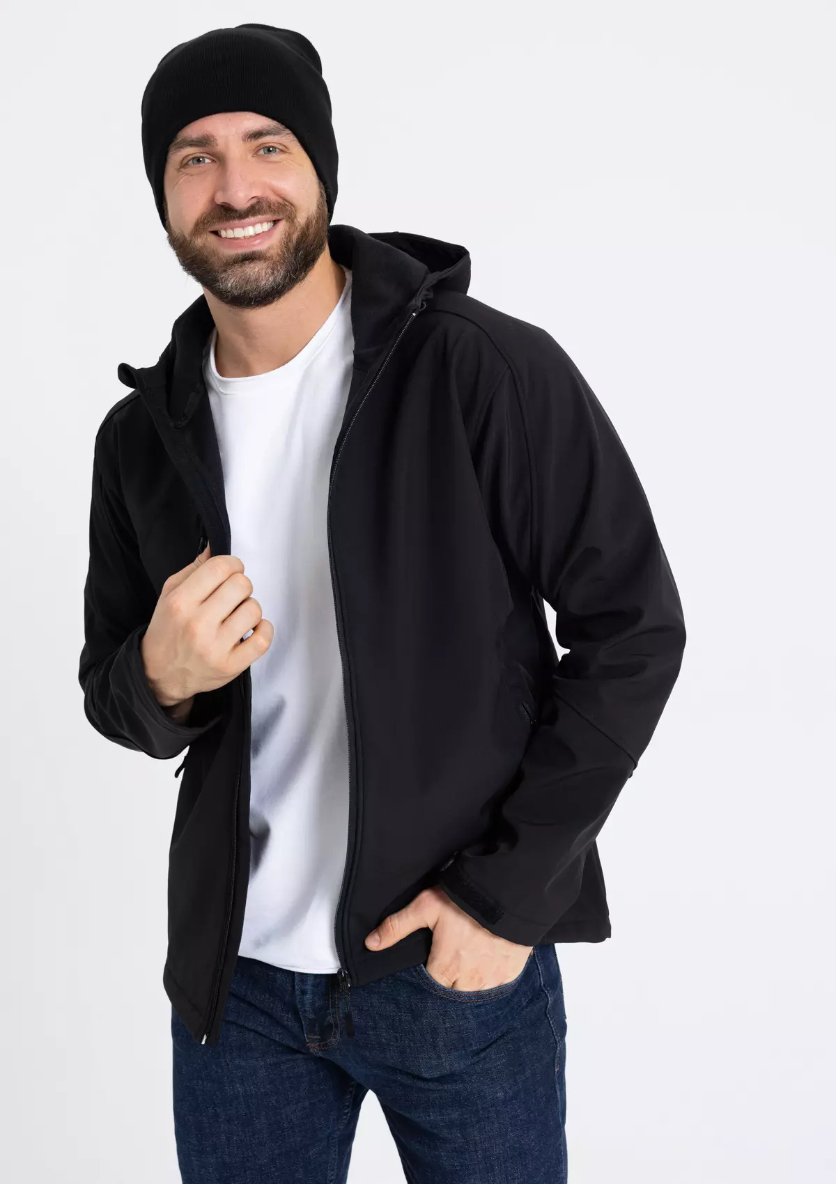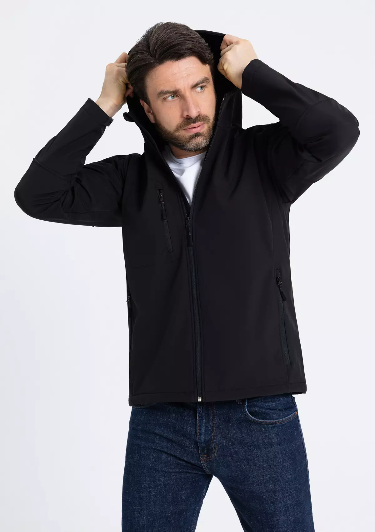 Универсальная куртка прямого силуэта с воротником-стойкой, переходящим в капюшон с регулируемым прилеганием. Рукав-реглан, прорезной карман и застежка на молнию с внутренней ветрозащитной планкой. Крой дополнен функциональными элементами: внешний и внутренний прорезной карман, лента «велкро» на манжете, кулиса на капюшоне и пол линии низа изделия.