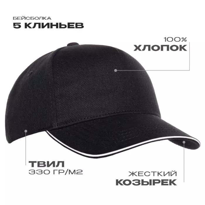 Пятиклиновый пошив, отсутствие лобового шва и изогнутый жесткий козырек «сэндвич» с контрастным кантом. Посадка регулируется ремешком с металлической застежкой.