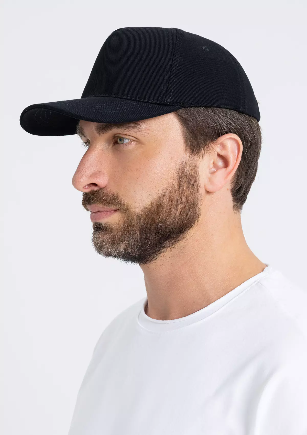 Бейсболка-пятиклинка без лобового шва с изогнутым жестким козырьком и регулируемой металлической застежкой.