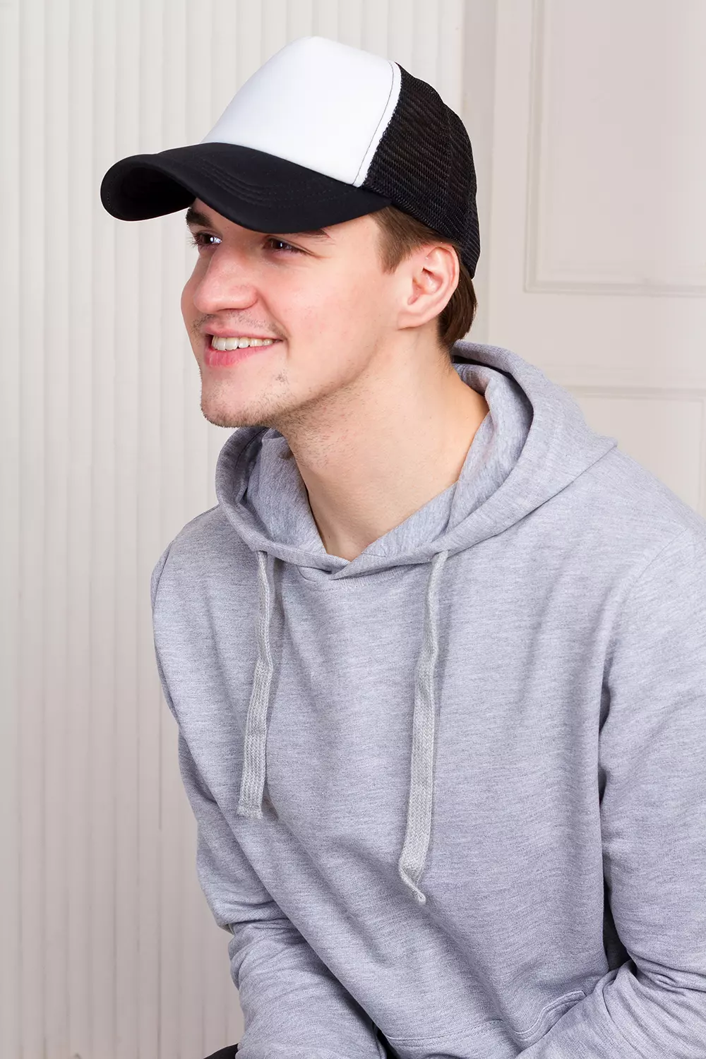 Бейсболка-тракер без лобового шва с жёстким изогнутым козырьком, плотность прилегания регулирует надежная пластиковая застежка. Передний клин и козырек усилены поролоном, благодаря чему модель имеет узнаваемый характерный силуэт.