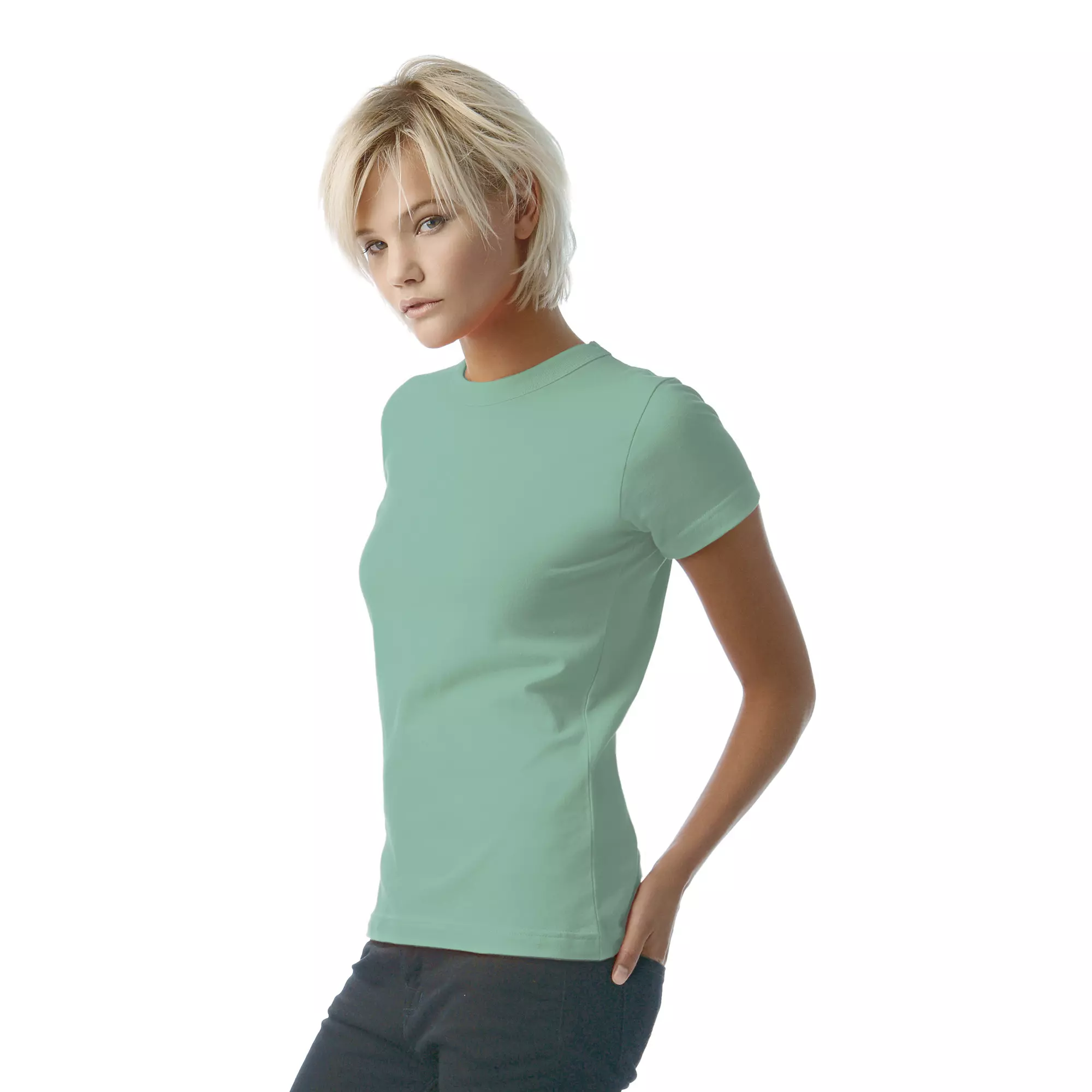 Футболка женская, приталенная, с боковыми швами, плотностью 185 г/кв.м.; воротник с резинкой 1х1. Края рукавов и низ футболки с двойной прострочкой.