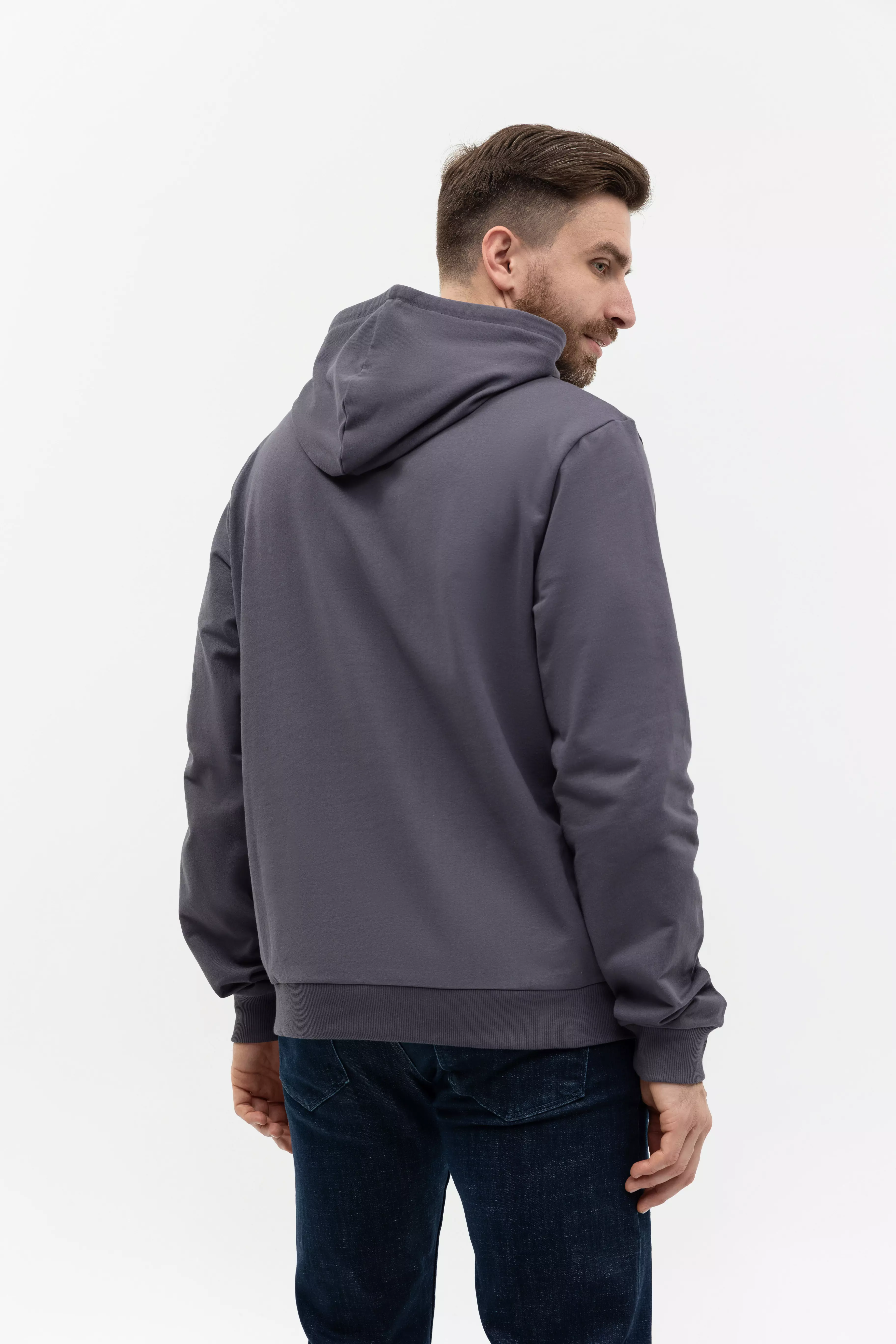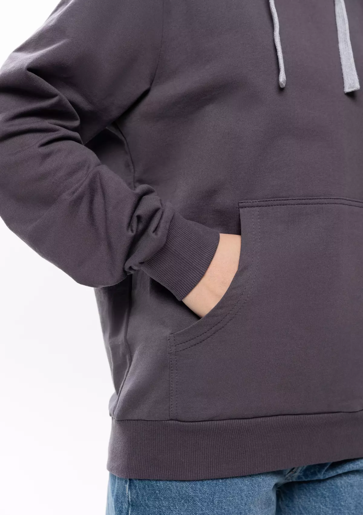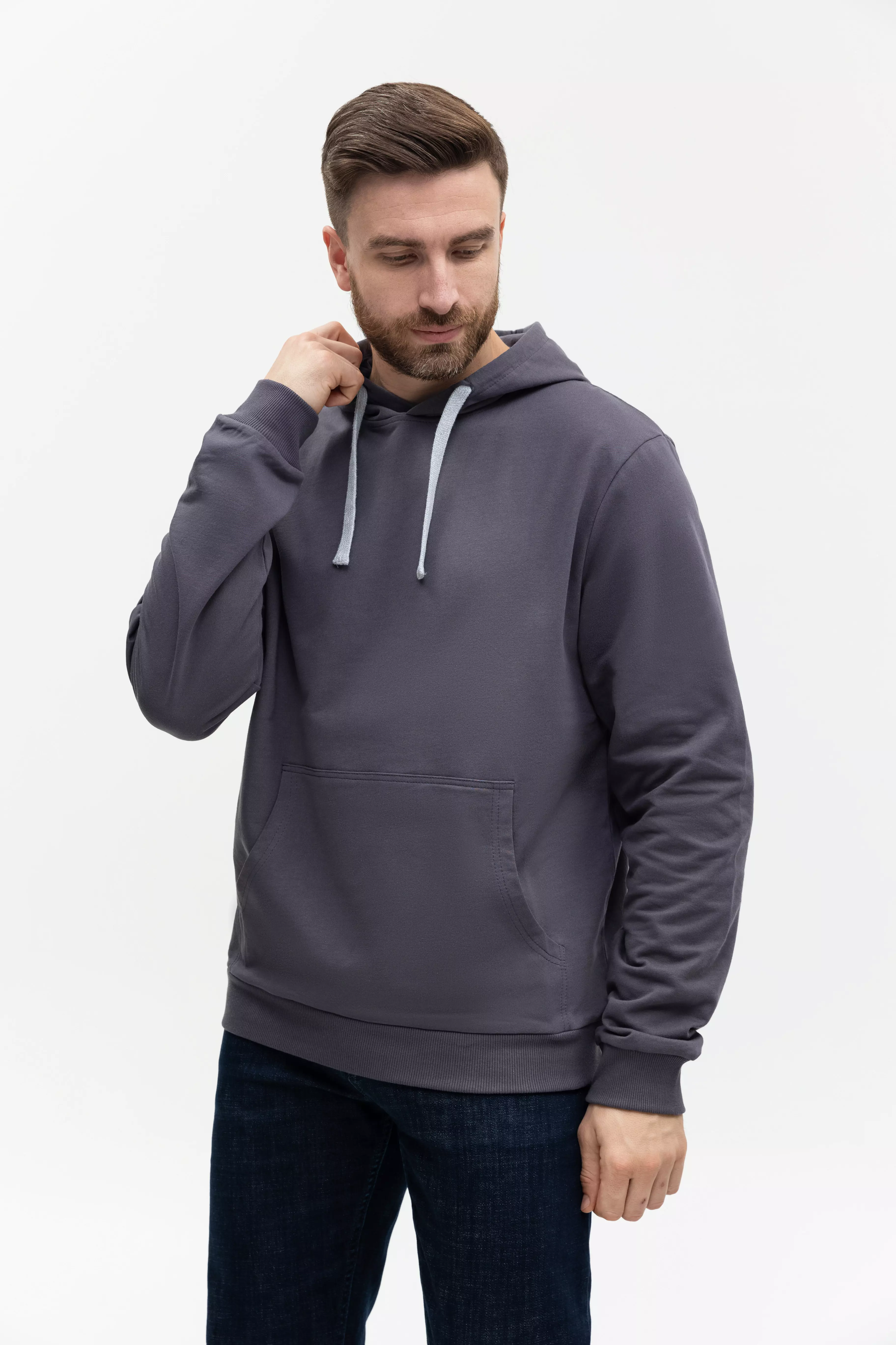 Толстовка прямого силуэта с капюшоном, втачным рукавом и карманом-кенгуру. Капюшон дополнен шнурком для регулирования прилегания, манжет и низ изделия оформлены широкой эластичной резинкой. Возможно два варианта исполнения: контрастные шнурок и бейка/шнурок и бейка в цвет толстовки.