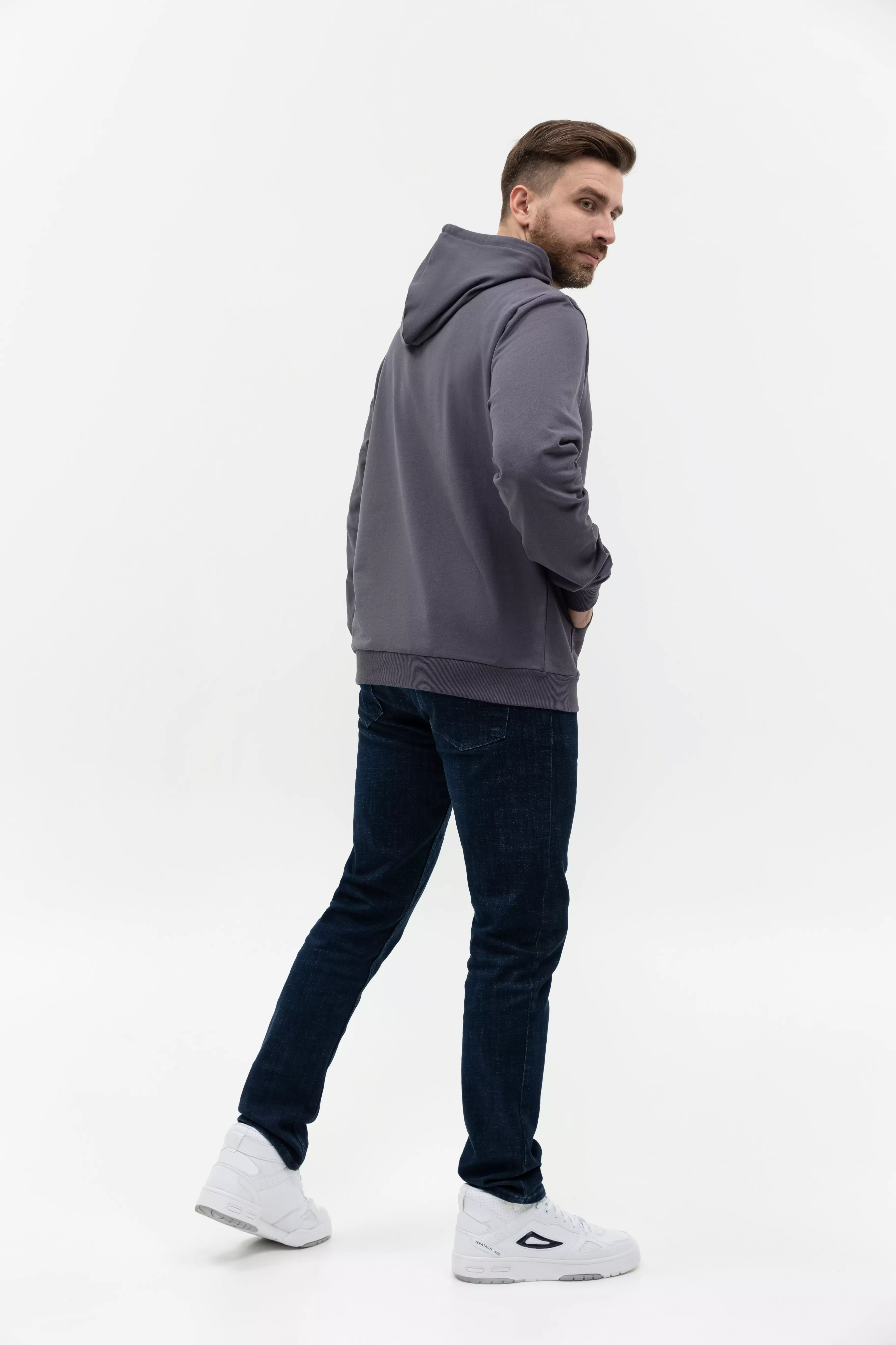 Толстовка прямого силуэта с капюшоном, втачным рукавом и карманом-кенгуру. Капюшон дополнен шнурком для регулирования прилегания, манжет и низ изделия оформлены широкой эластичной резинкой. Возможно два варианта исполнения: контрастные шнурок и бейка/шнурок и бейка в цвет толстовки.