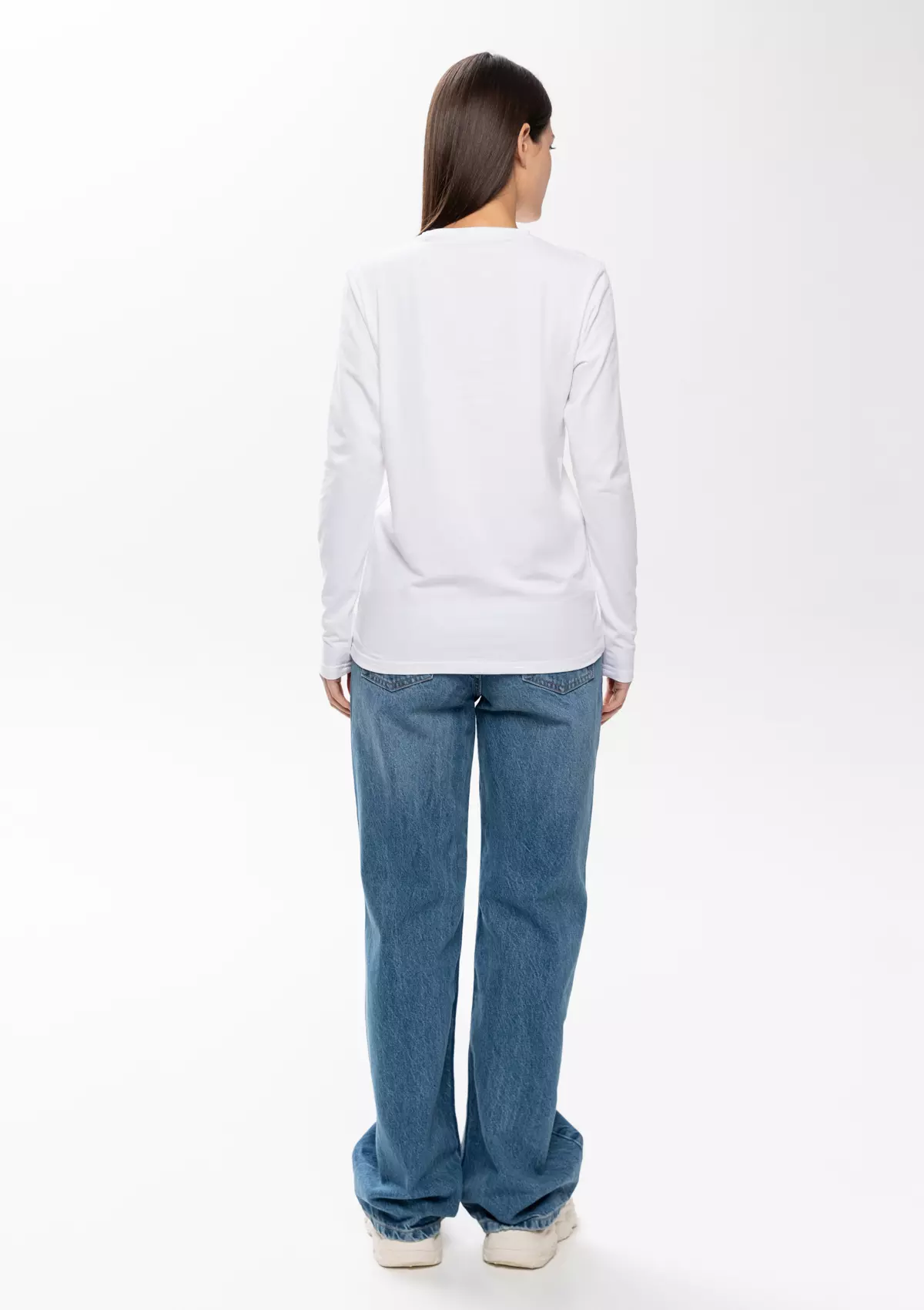 Универсальная футболка прямого силуэта с округлым воротом и длинным втачным рукавом. Плечевые швы и шов горловины усилены настрочной бейкой из основного полотна.