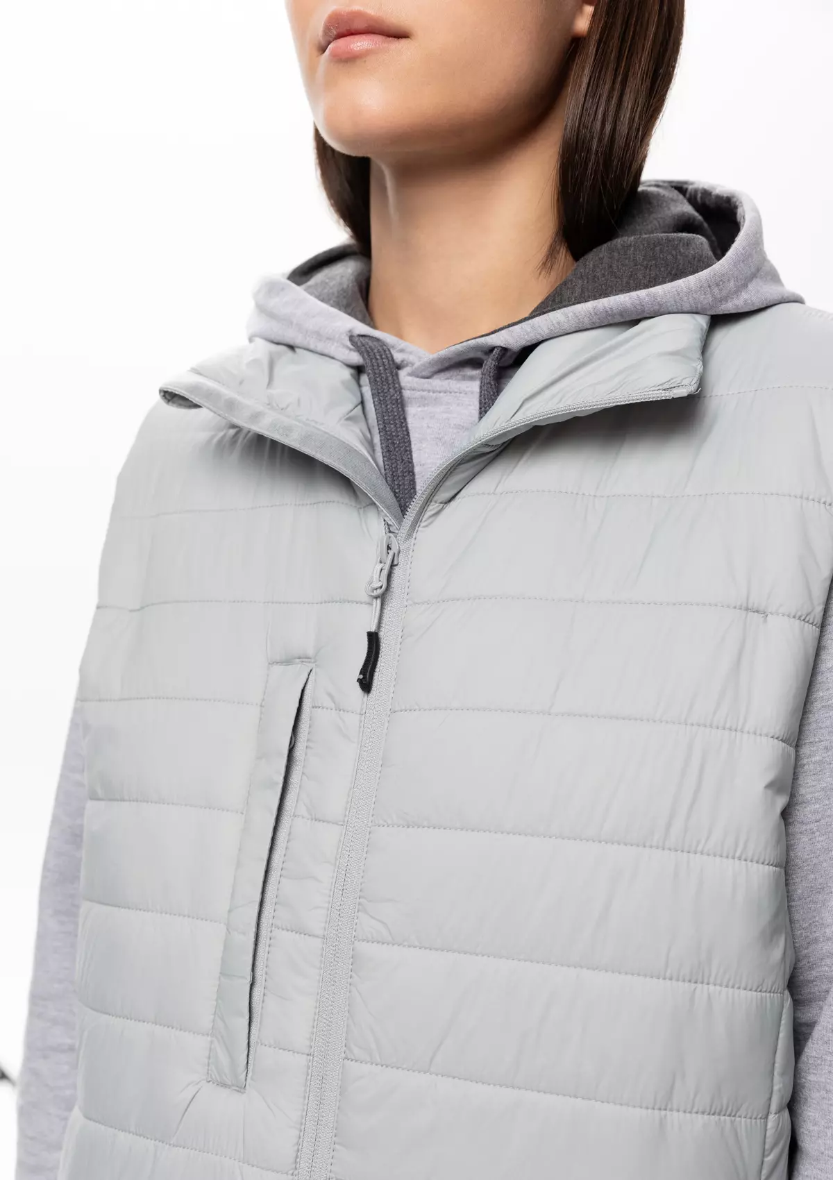 Ультралегкий жилет прямого силуэта с горизонтальной стежкой, воротником-стойкой, функциональным карманом по правой полочке, прорезным карманом и застежкой на молнию с внутренней ветрозащитной планкой. В комплекте прилагается сумка-чехол __amp__amp;#40;технологии нанесения: шелкотрансфер и DTF-печать__amp__amp;#41;.