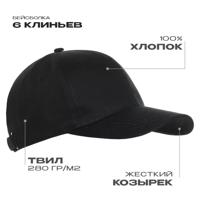 Бейсболка-шестиклинка с классическим изогнутым козырьком и застежкой на ленту с металлическим замком в тон основному цвету изделия.