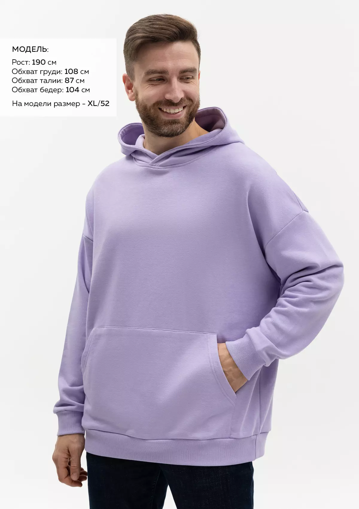 Размер мужского худи: XL/52. Параметры модели: рост 190 см.; обхват груди 108 см.; обхват талии 87 см.; обхват бедер 104 см.