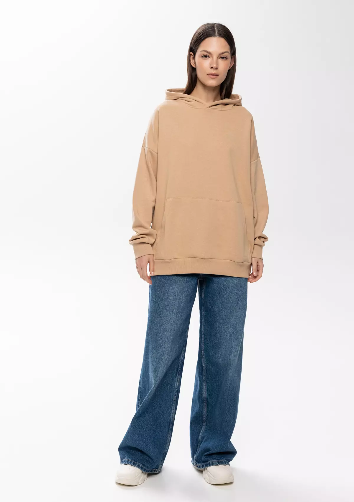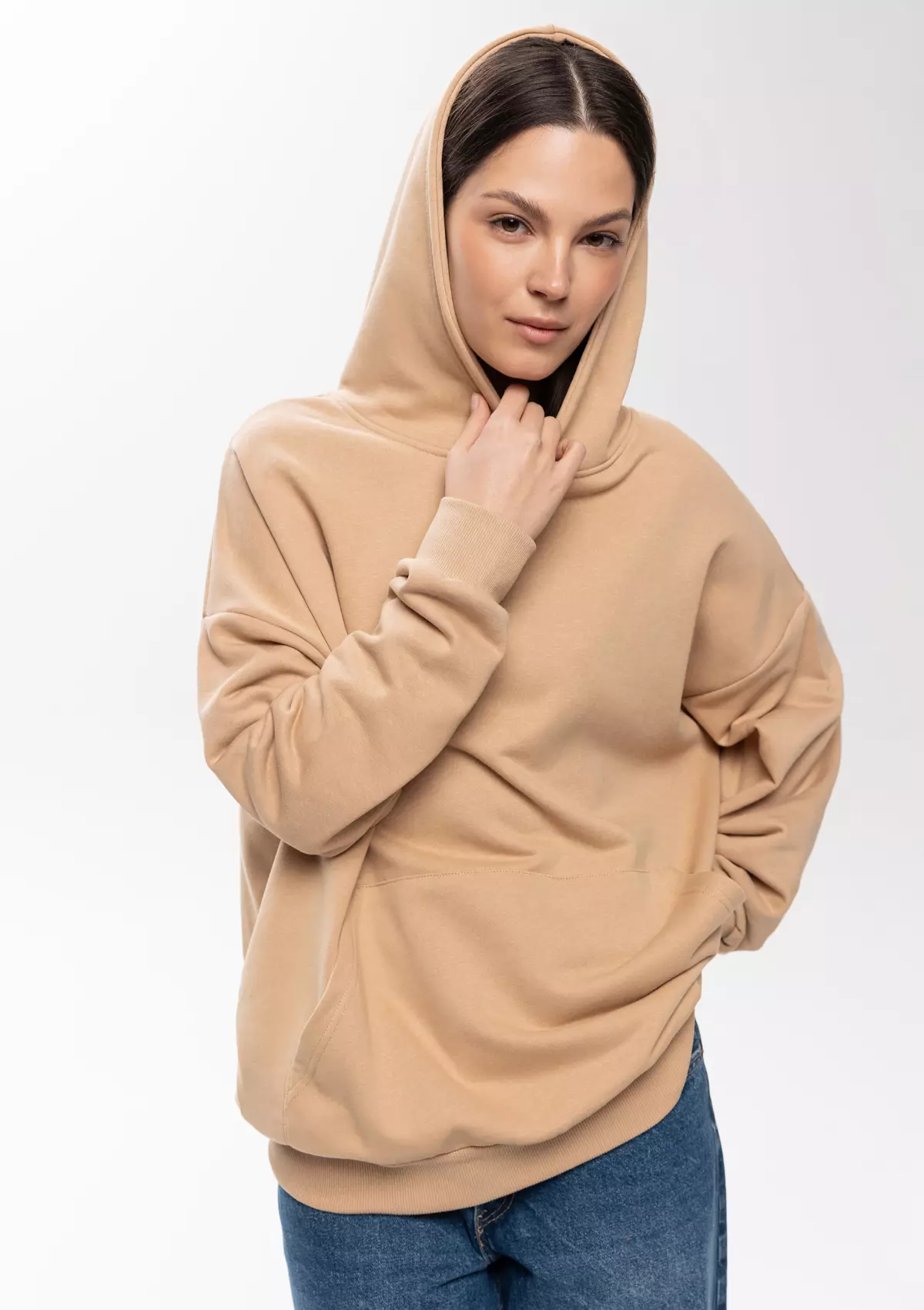 Универсальная толстовка свободного силуэта с капюшоном комфортной глубины, спущенной линией плеча и глубоким карманом-кенгуру. Манжет и низ изделия оформлены широкой эластичной резинкой.