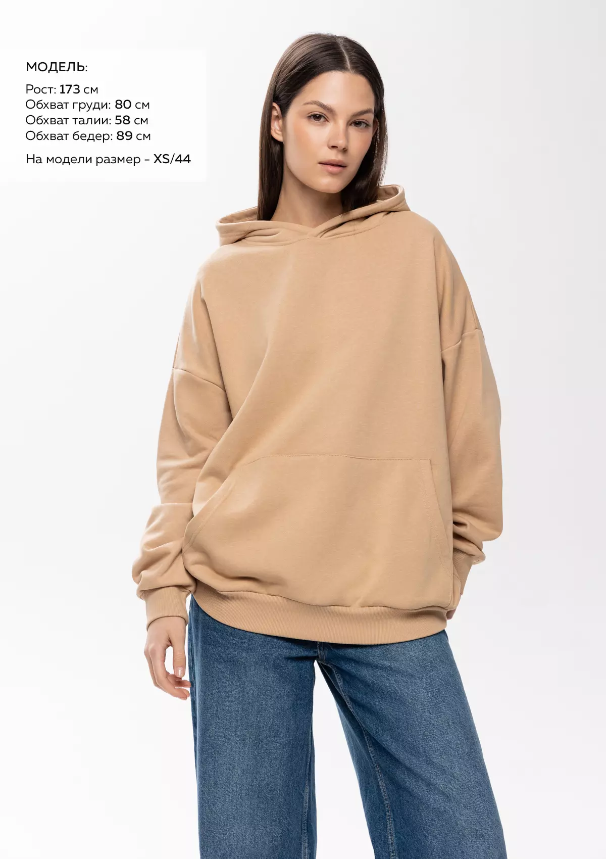 Размер женского худи: XS/44. Параметры модели: рост 173 см.; обхват груди 80 см.; обхват талии 58 см.; обхват бедер 89 см.