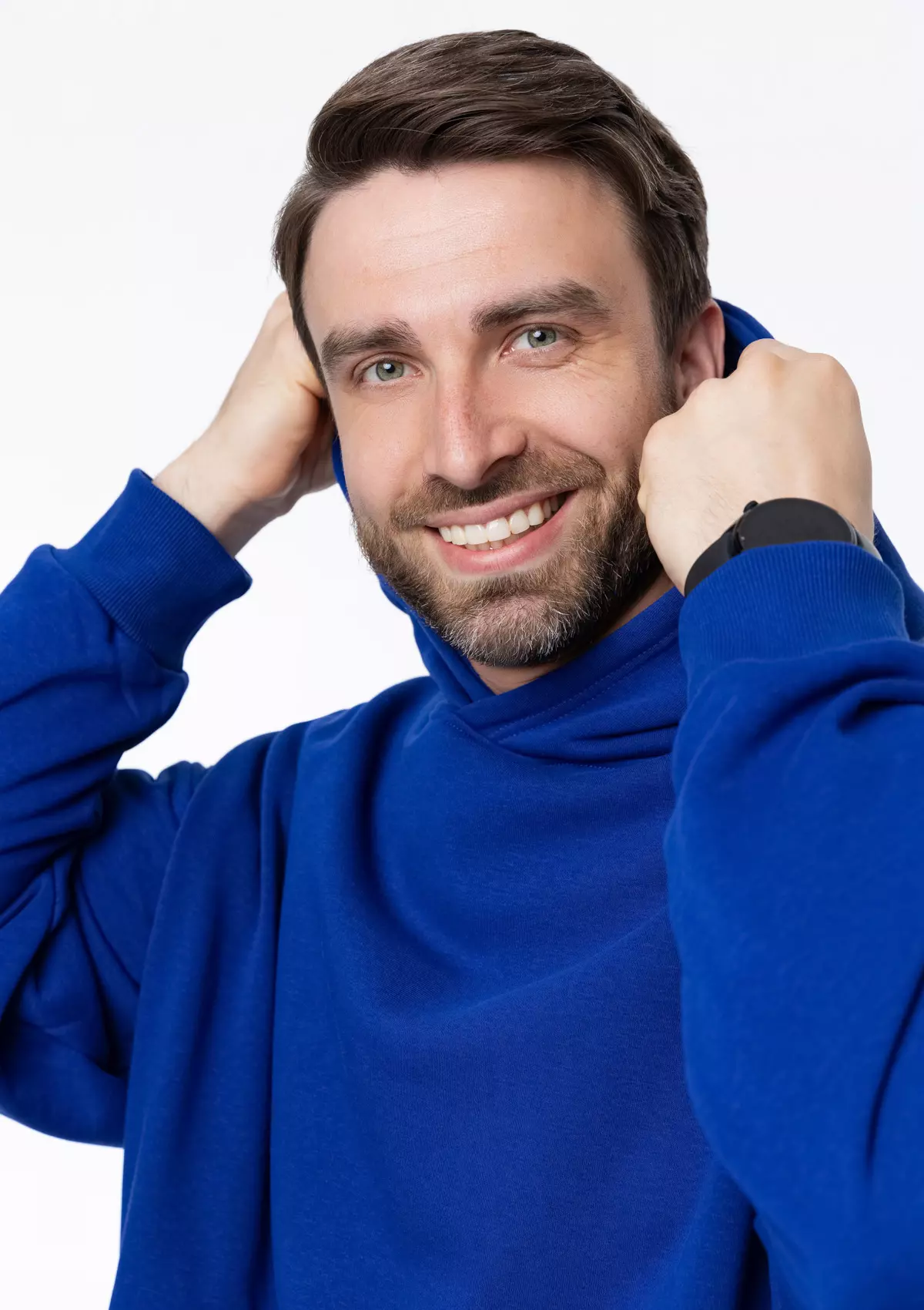 Размер мужского худи: XL/52. Параметры модели: рост 190 см.; обхват груди 108 см.; обхват талии 87 см.; обхват бедер 104 см.