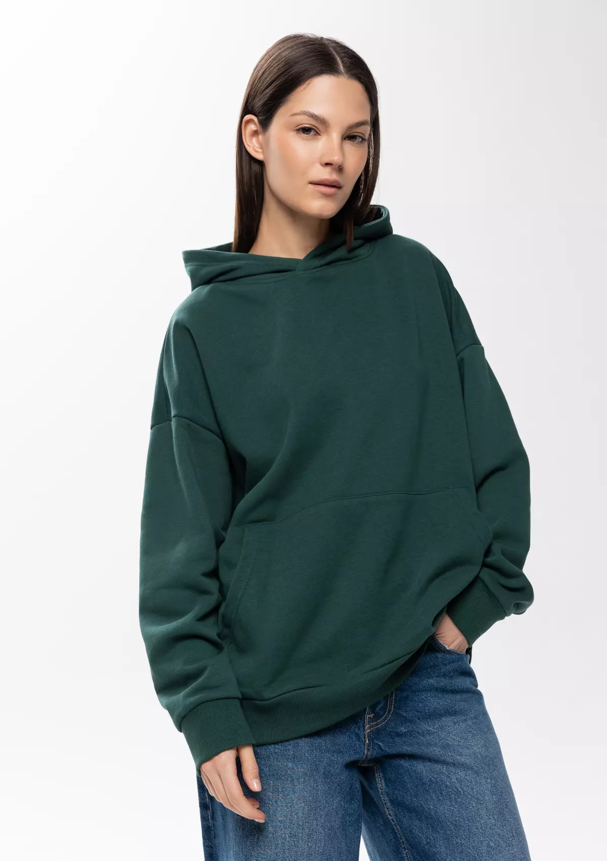 Универсальная толстовка свободного силуэта с капюшоном комфортной глубины, спущенной линией плеча и глубоким карманом-кенгуру. Манжет и низ изделия оформлены широкой эластичной резинкой.