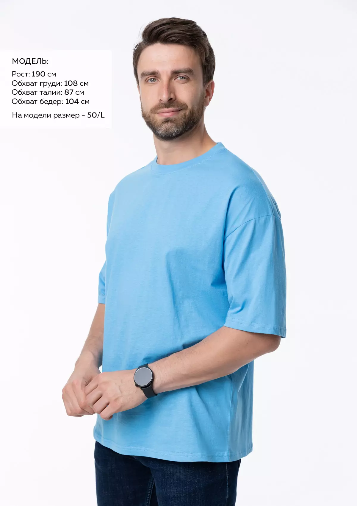 Размер мужской футболки: 50/L. Параметры модели: рост 190 см.; обхват груди 108 см.; обхват талии 87 см.; обхват бедер 104 см.