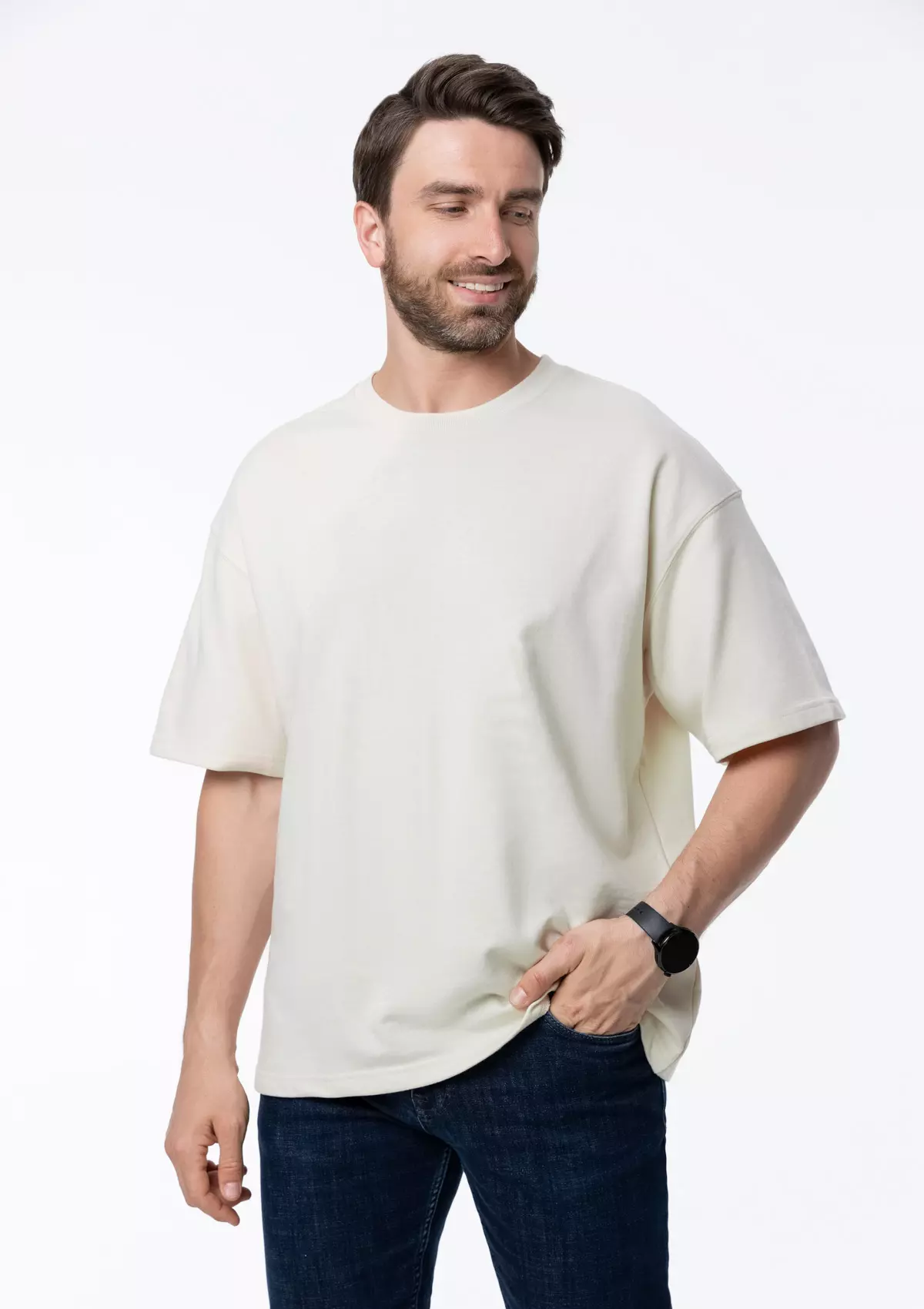 Футболка свободного кроя с округлым воротом и спущенной линией плеча. Шов горловины спинки усилен киперной лентой в тон основному цвету. Универсальная модель идеально впишется как в мужской, так и в женский гардероб.