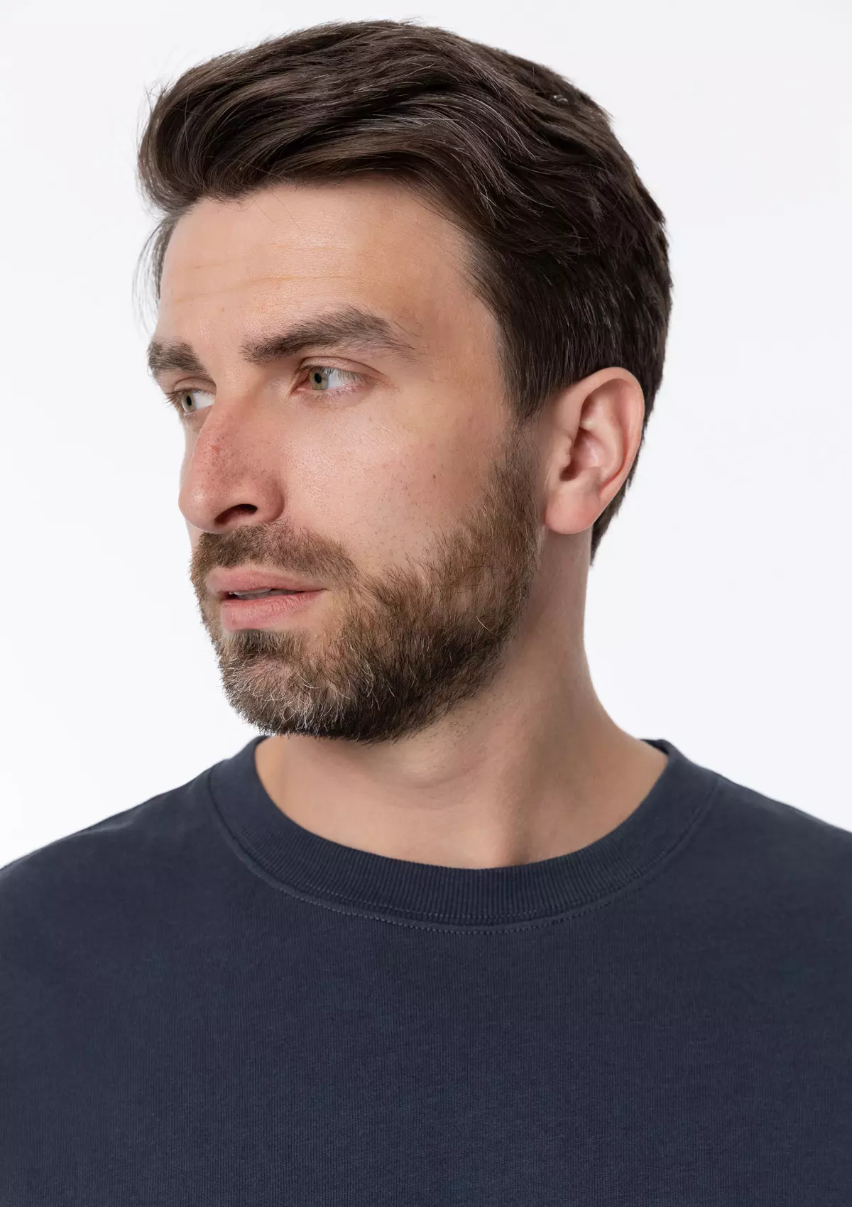 Футболка свободного кроя с округлым воротом и спущенной линией плеча. Шов горловины спинки усилен киперной лентой в тон основному цвету. Универсальная модель идеально впишется как в мужской, так и в женский гардероб.