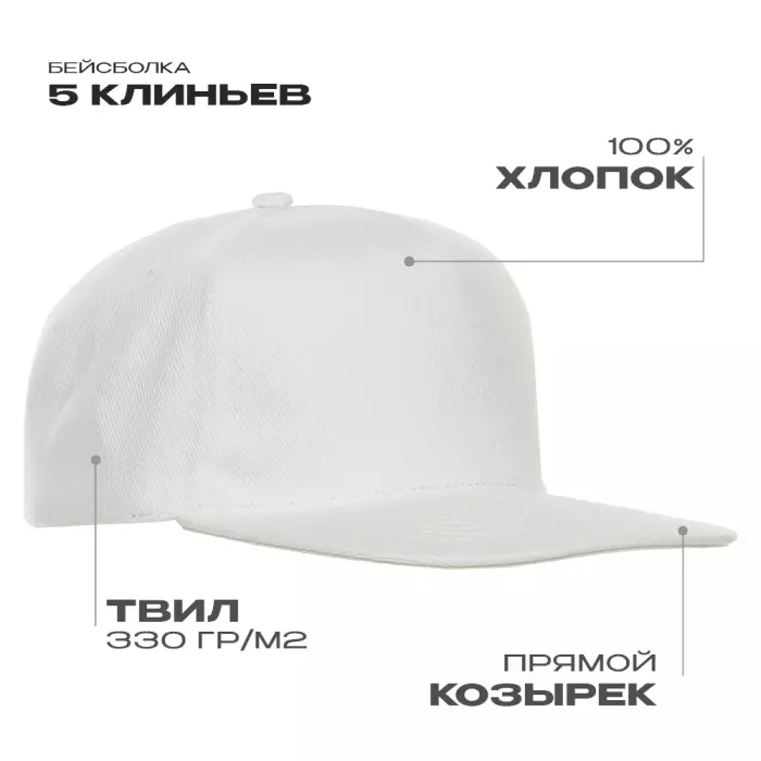 Бейсболка-пятиклинка с прямым жестким козырьком и пластиковой регулируемой застежкой.