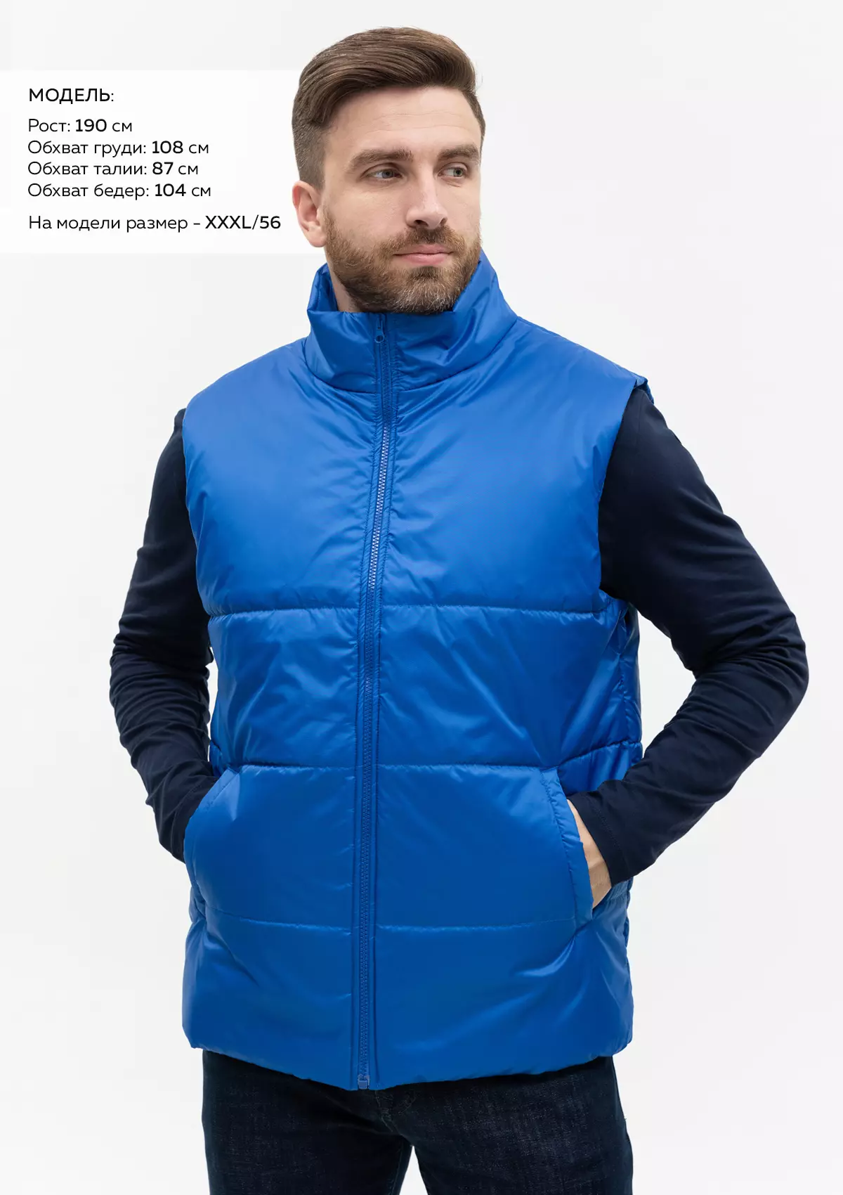 Размер на модели: XXL/54. Параметры модели: рост 190 см.; обхват груди 108 см.; обхват талии 87 см.; обхват бедер 104 см.