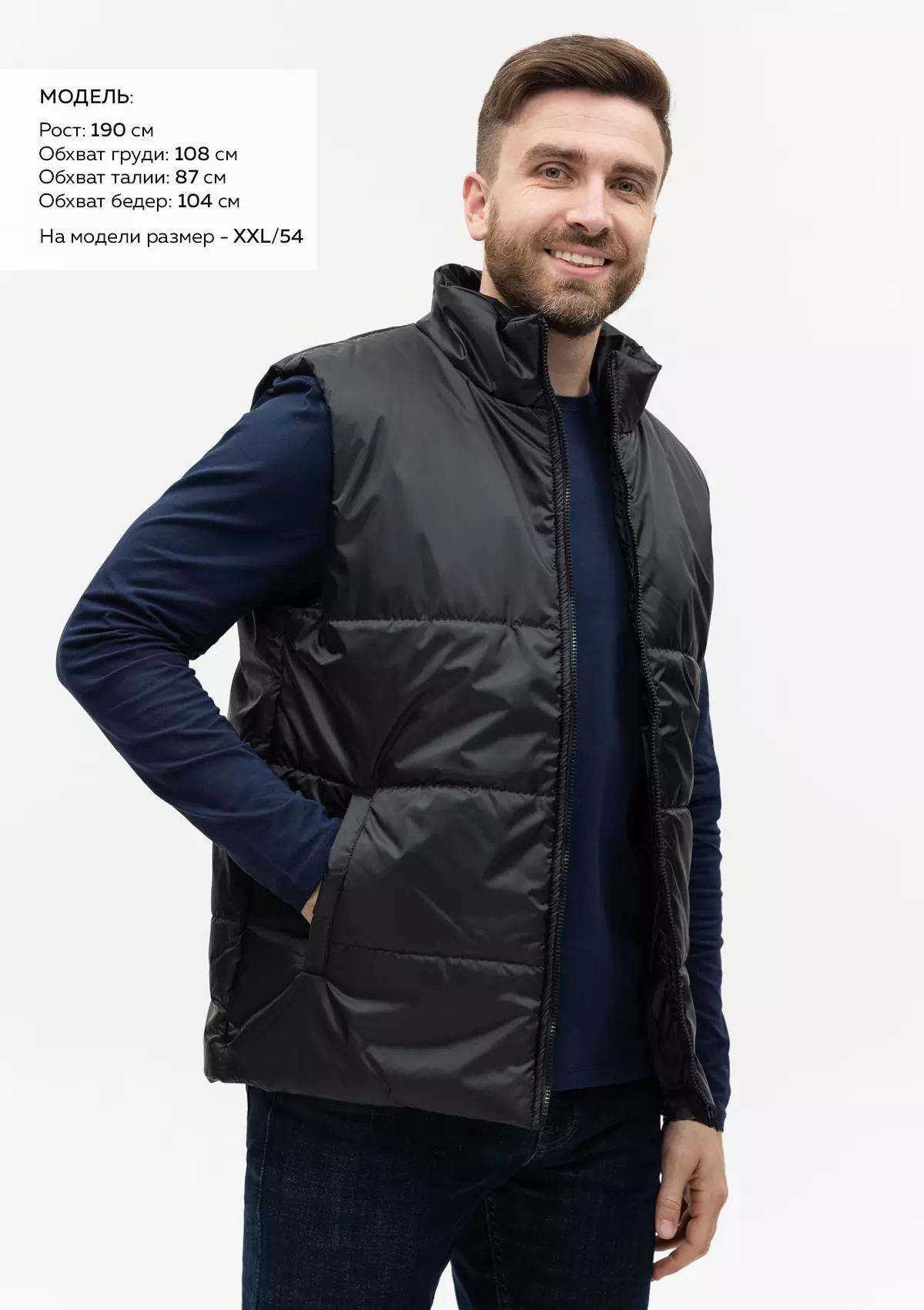 Размер на модели: XXL/54. Параметры модели: рост 190 см.; обхват груди 108 см.; обхват талии 87 см.; обхват бедер 104 см.