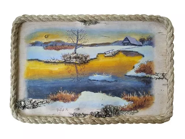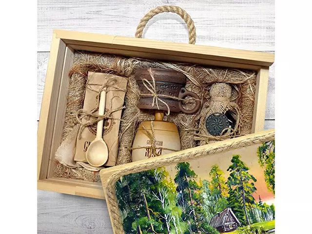 Подарочный набор в уникальном деревянном коробке с рисунком на бересте:: безалкогольный бальзам “Сибирь”, зеленый чай из целебных, сибирских трав, настоящий сибирский мед в бочонке, кедровая ложка, льняная салфетка, керамическая чашка.