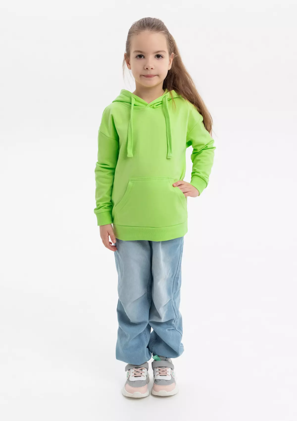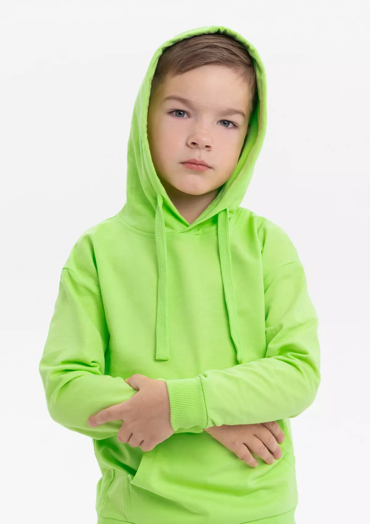 Модель прямого силуэта с капюшоном комфортной глубины, спущенной линией плеча и накладным карманом-кенгуру. Капюшон регулируется плоским шнуром, горловина спинки усилена киперной лентой. Манжет и низ изделия выполнены широкой эластичной резинкой в тон основному цвету.