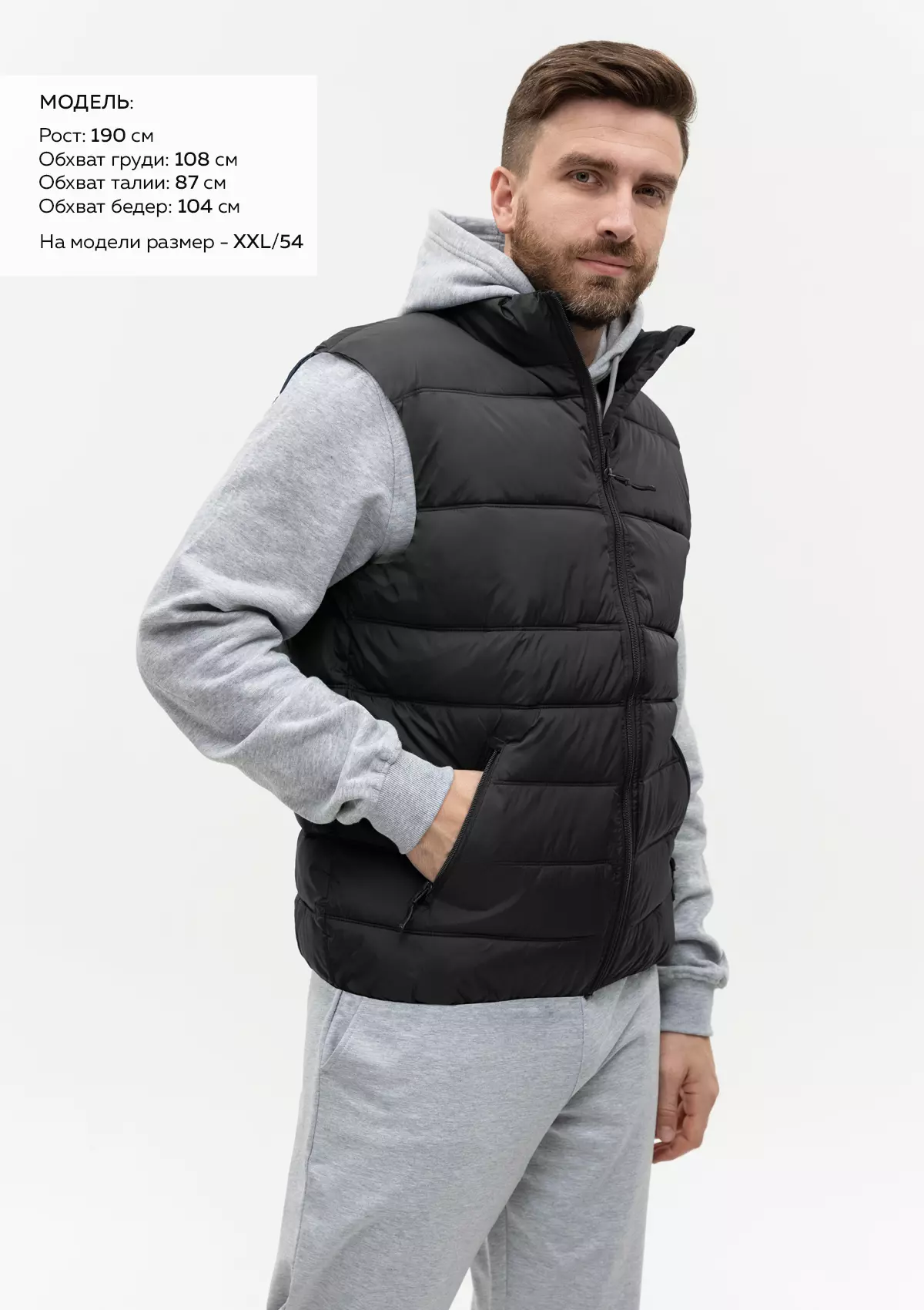 Мужской жилет прямого силуэта с геометричной стежкой, воротником-стойкой, прорезным карманом и застежкой на молнию. Изделие дополнено контрастной резинкой по пройме и линии низа для дополнительной защиты от холода и ветра.
