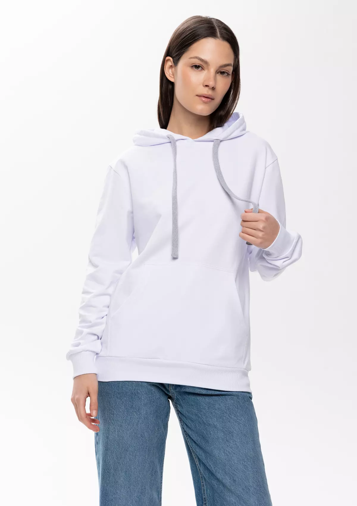 Толстовка прямого силуэта с капюшоном, втачным рукавом и карманом-кенгуру. Капюшон дополнен шнурком для регулирования прилегания, манжет и низ изделия оформлены широкой эластичной резинкой. Возможно два варианта исполнения: контрастные шнурок и бейка/шнурок и бейка в цвет толстовки.