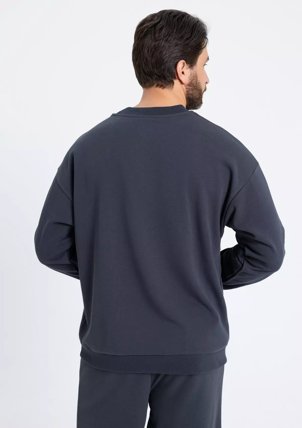 Свитшот расслабленного кроя с широкой горловиной, спущенной линией плеча и манжетами на рукавах по нижнему краю изделия.