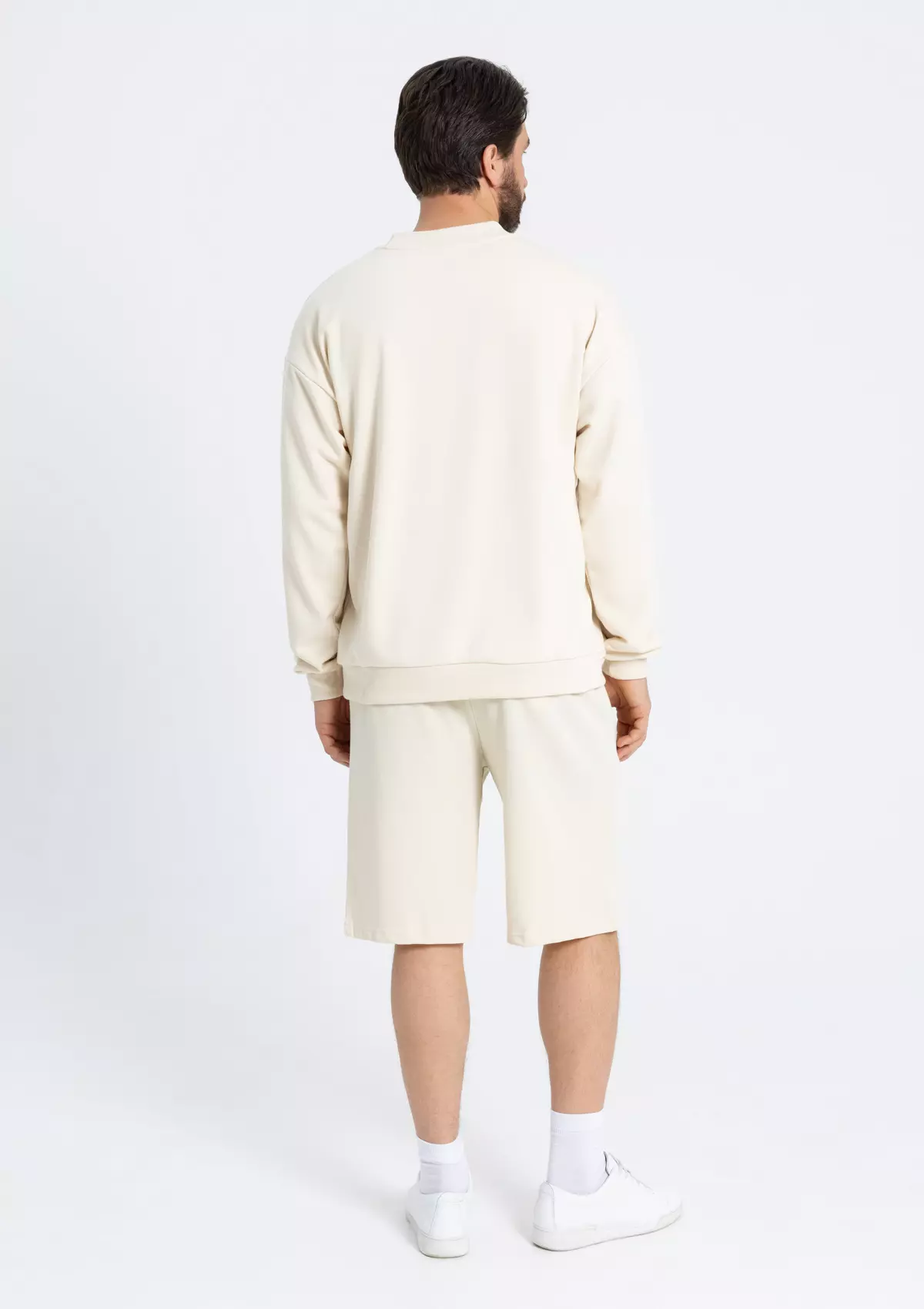 Свитшот расслабленного кроя с широкой горловиной, спущенной линией плеча и манжетами на рукавах по нижнему краю изделия.