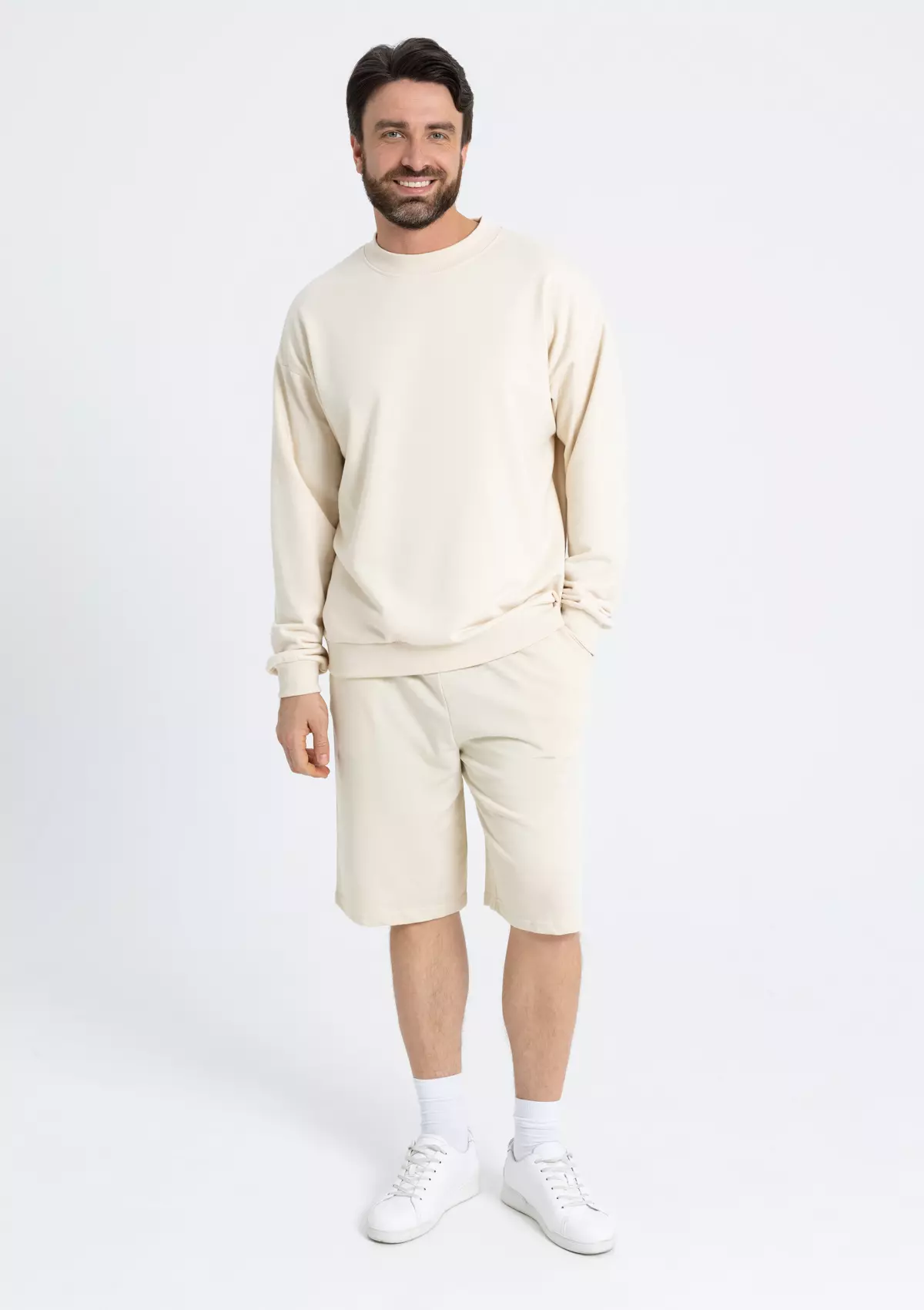 Свитшот расслабленного кроя с широкой горловиной, спущенной линией плеча и манжетами на рукавах по нижнему краю изделия.