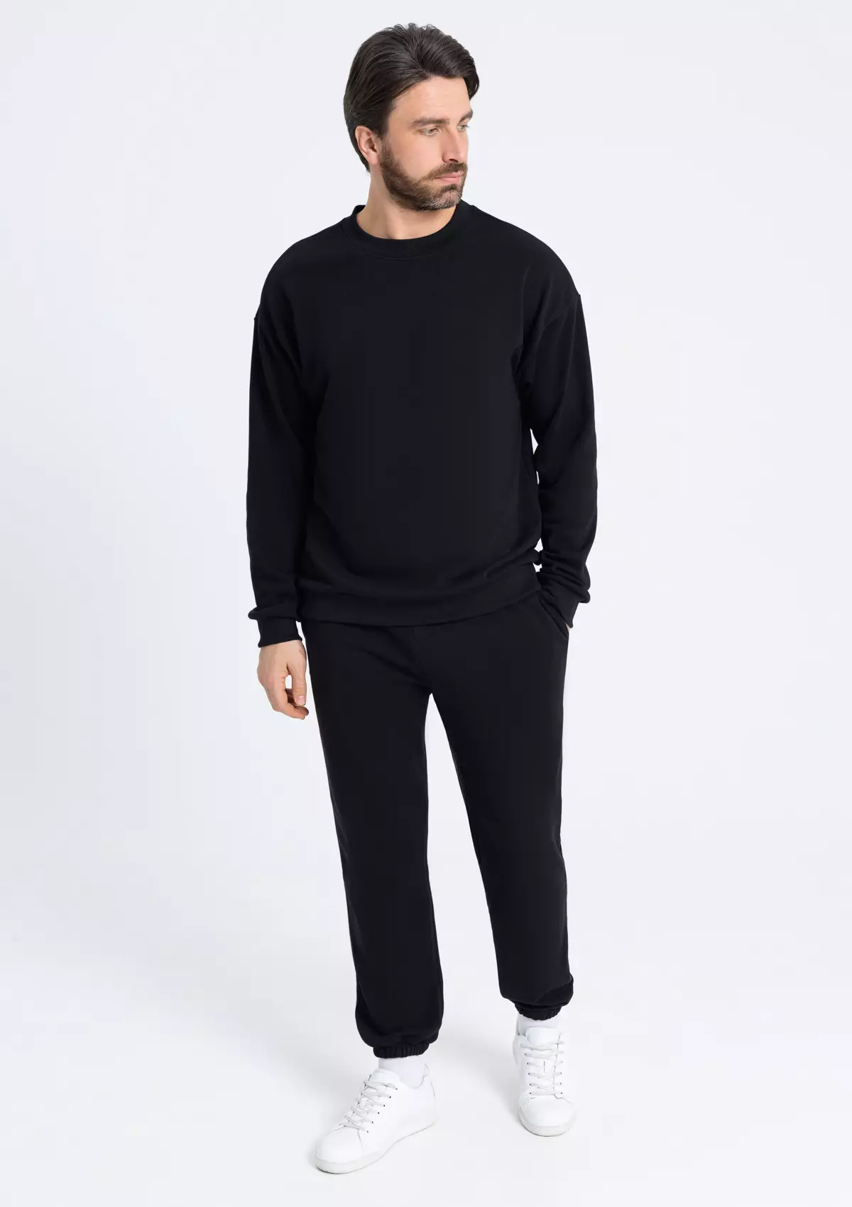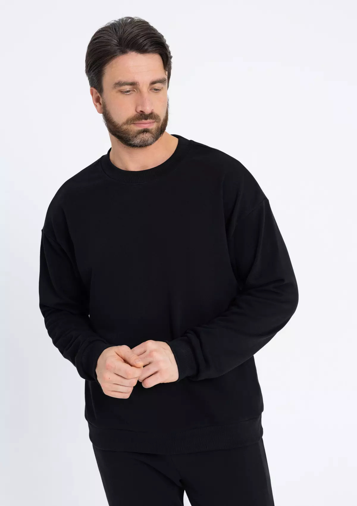 Свитшот расслабленного кроя с широкой горловиной, спущенной линией плеча и манжетами на рукавах по нижнему краю изделия.