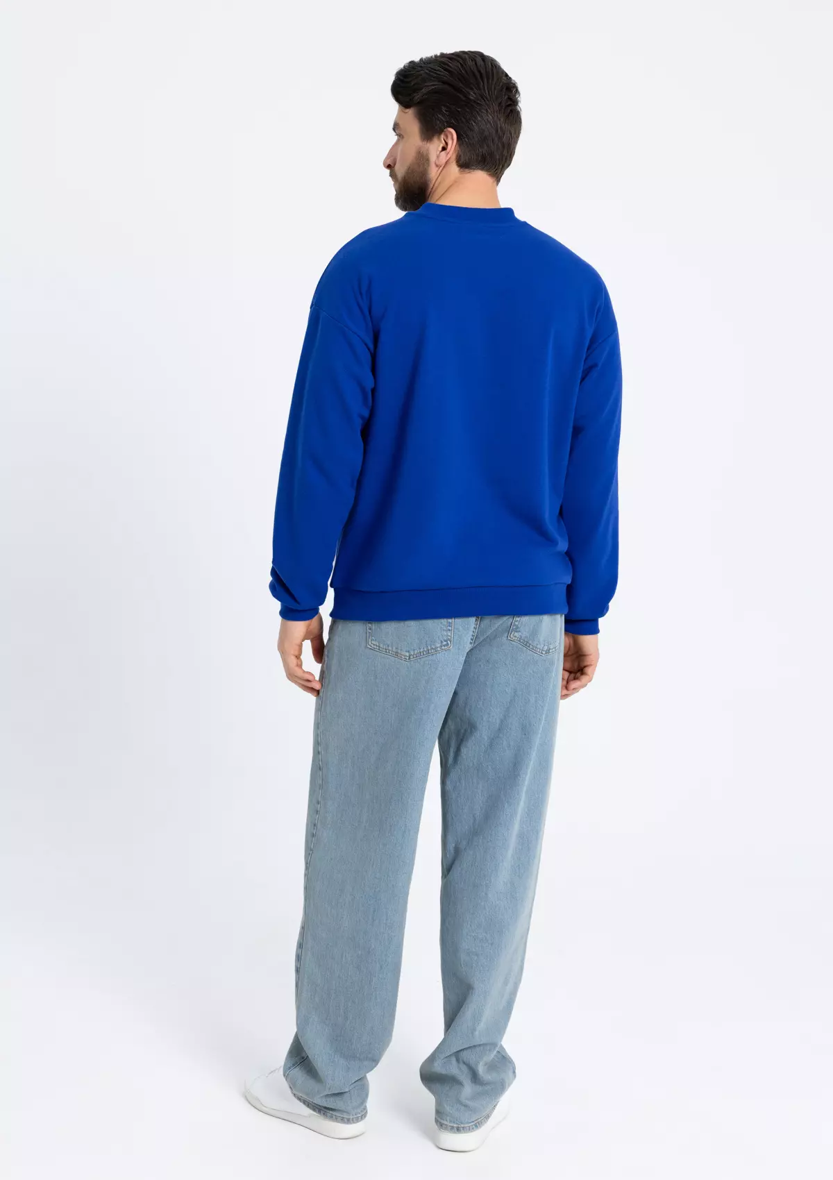 Свитшот расслабленного кроя с широкой горловиной, спущенной линией плеча и манжетами на рукавах по нижнему краю изделия.