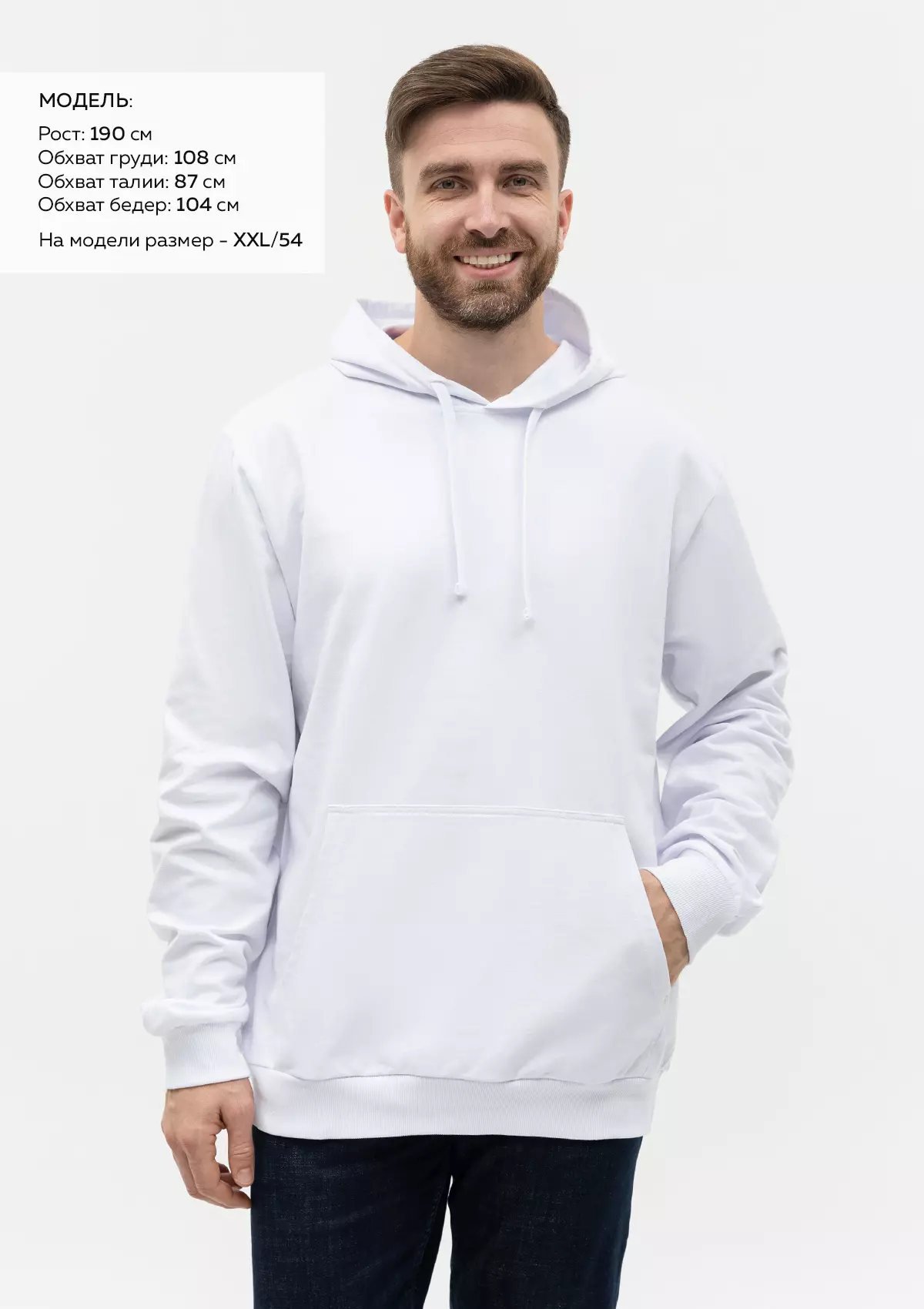 Размер мужского худи: XL/52. Параметры модели: рост 190 см.; обхват груди 108 см.; обхват талии 87 см.; обхват бедер 104 см.