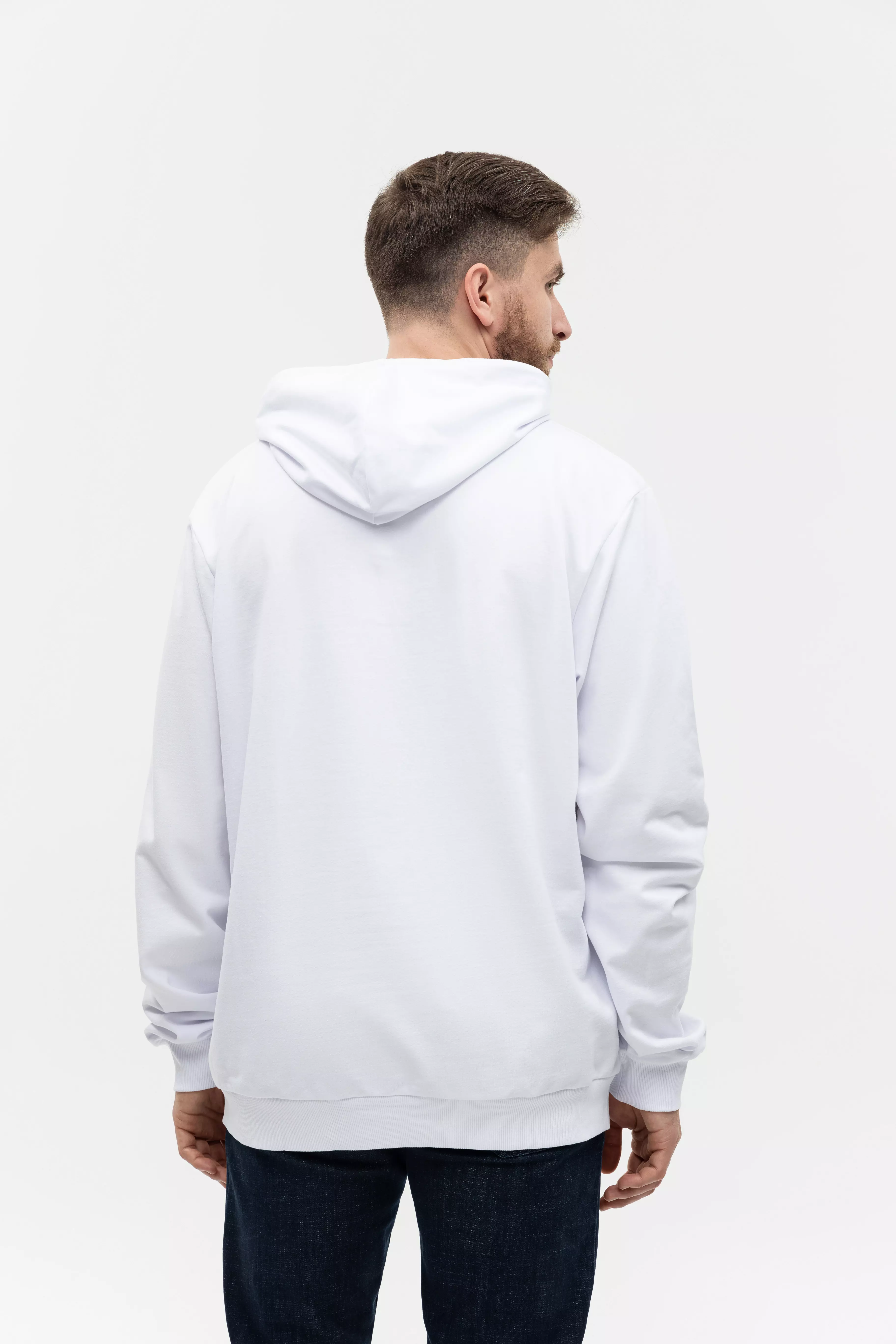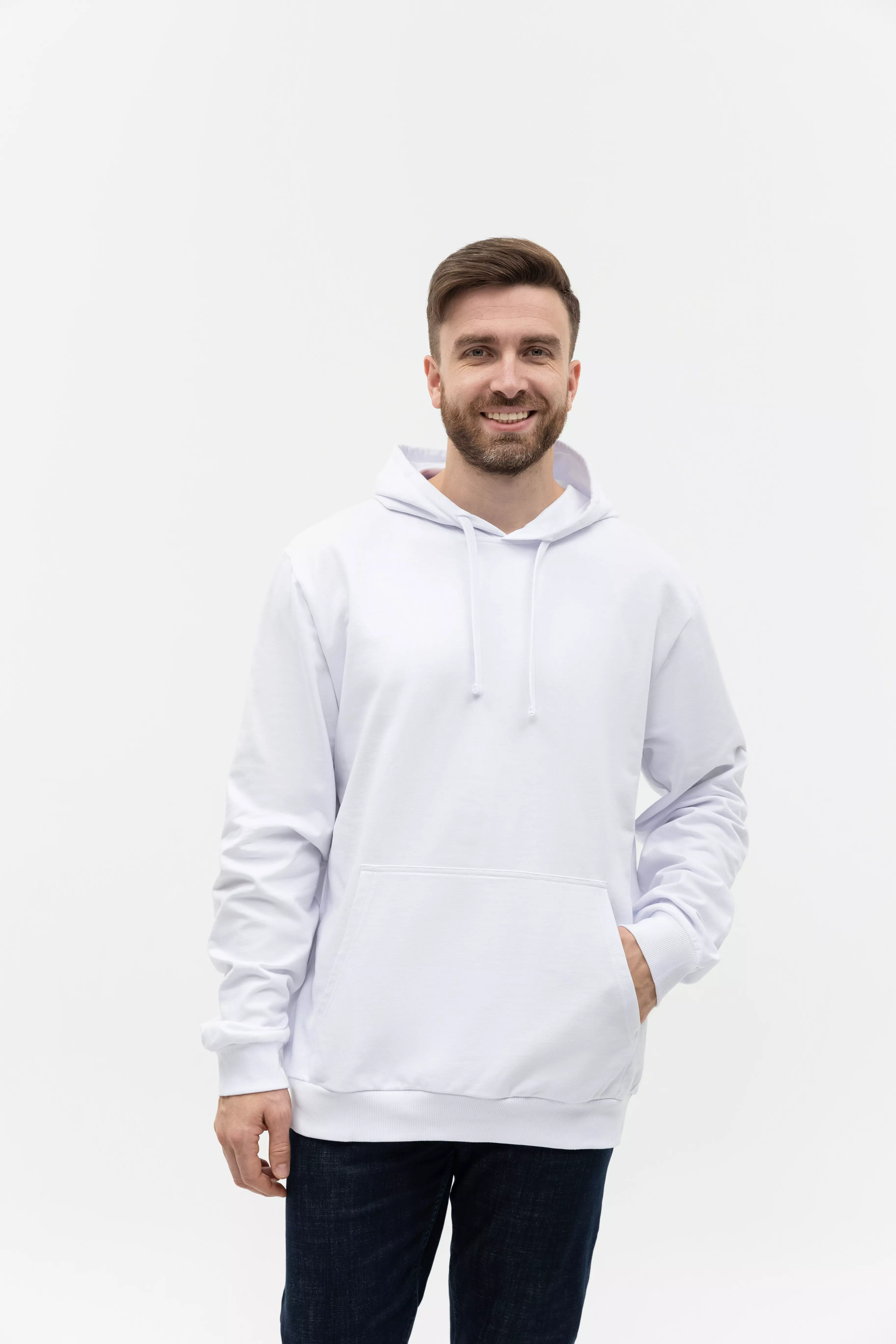 Толстовка прямого силуэта с капюшоном, втачным рукавом и карманом-кенгуру. Капюшон дополнен шнурком для регулирования прилегания, манжет и низ изделия оформлены широкой эластичной резинкой. Возможно два варианта исполнения: контрастные шнурок и бейка/шнурок и бейка в цвет толстовки.