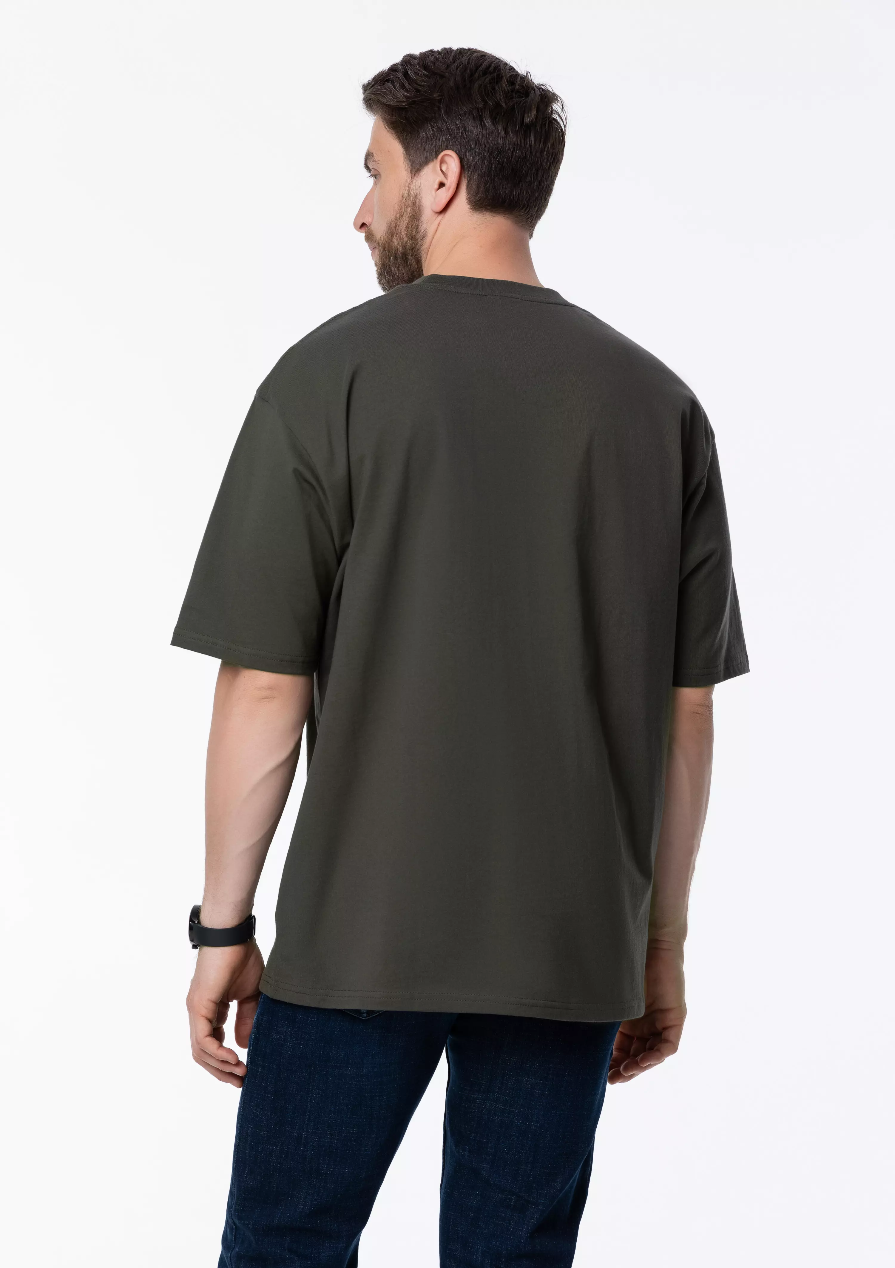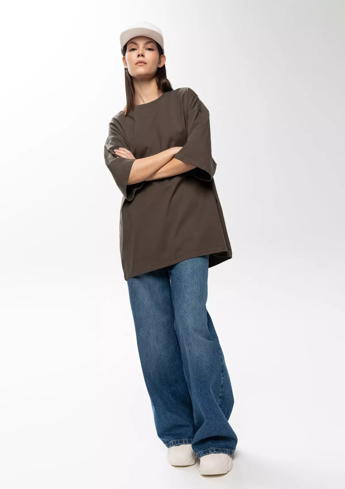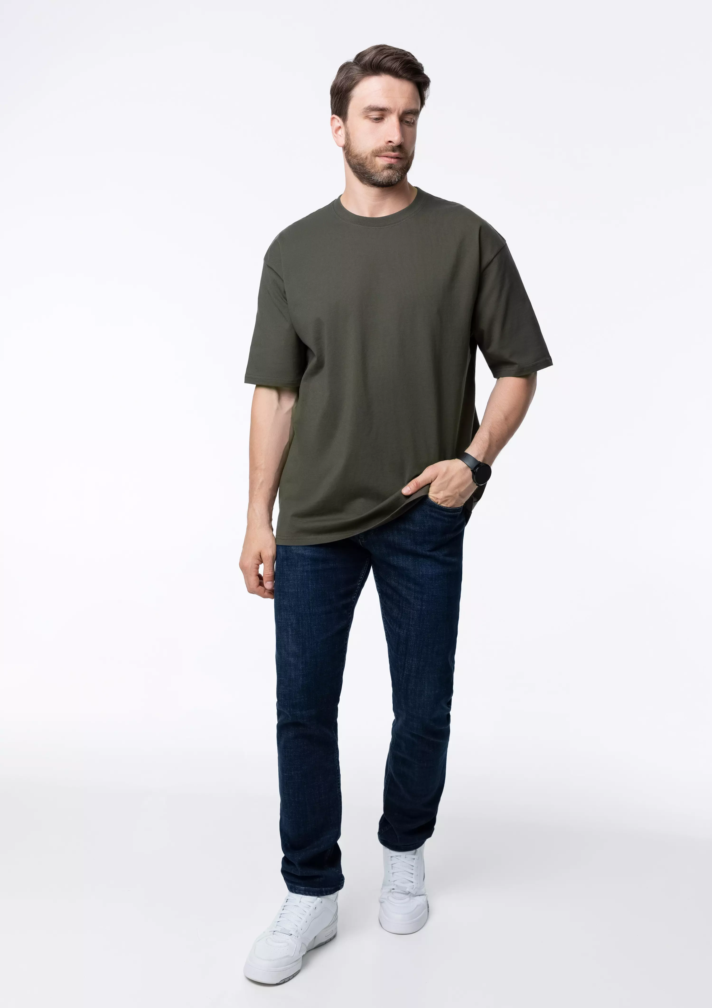 Универсальная футболка силуэта-oversize с округлым воротом и спущенной линией плеча.